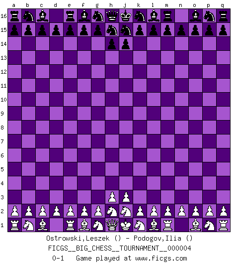 Last move : 0-1 2007 April 30 1:10:50 [Event "FICGS__BIG_CHESS__TOURNAMENT__000004"] [Site "FICGS"] [Date "2007.03.30"] [Round "1"] [White "Ostrowski,Leszek"] [Black "Podogov,Ilia"] [Result "0-1"] [WhiteElo ""] [BlackElo ""] 0-1 This big chess game has been lost on time (started : 2007.03.30 22:20:0) Follow this game move after move (download)Chess demands total concentration. (Bobby Fischer) Als ich elf wurde, wurde ich einfach gut. (Robert James Fischer) Una partida de Ajedrez se divide en 3 etapas: la primera cuando piensas que tienes la ventaja, la segunda cuando crees que tienes la ventaja y la tercera... ¡cuando te das cuenta que vas a perder!. (Savielly Tartakower) Toutes les manuvres exécutées sur une colonne ouverte ont pour but ultime l'intrusion définitive sur la septième ou la huitième rangée, en plein cur de la position ennemie. (Aaron Nimzovitch) It is the aim of the modern school, not to treat every position according to one general law, but according to the principle inherent in the position. (Richard Reti)