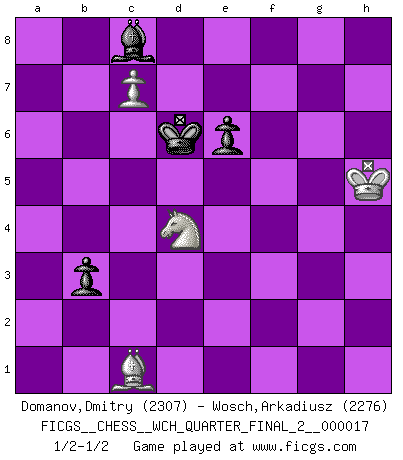 Last move : 1/2-1/2 2017 May 13 2:45:55 [Event "FICGS__CHESS__WCH_QUARTER_FINAL_2__000017"] [Site "FICGS"] [Date "2016.11.02"] [Round "3"] [White "Domanov,Dmitry"] [Black "Wosch,Arkadiusz"] [Result "1/2-1/2"] [WhiteElo "2307"] [BlackElo "2276"] 1.e4 e5 2.Nf3 Nc6 3.Bb5 a6 4.Ba4 Nf6 5.O-O Be7 6.Re1 b5 7.Bb3 d6 8.c3 O-O 9.h3 Bb7 10.d4 Re8 11.Nbd2 Bf8 12.a3 h6 13.Bc2 Nb8 14.b3 Nbd7 15.Bb2 g6 16.a4 Nh5 17.b4 exd4 18.cxd4 d5 19.e5 Bxb4 20.e6 Rxe6 21.Rxe6 fxe6 22.axb5 axb5 23.Rxa8 Bxa8 24.Bxg6 Nf4 25.Bb1 Qf6 26.Nf1 Bd6 27.Bc1 Nf8 28.Be3 Bc6 29.h4 N4g6 30.g3 Be8 31.N3h2 Nxh4 32.gxh4 Qxh4 33.Qf3 Bh5 34.Qg2+ Kf7 35.Bc2 b4 36.Ng3 Bg4 37.Nf3 Qf6 38.Ne1 Qh4 39.Nd3 Ng6 40.f4 Qe7 41.Qf2 Nh4 42.Nf1 Kg8 43.Ne5 Qg7 44.Kh2 Nf5 45.Bc1 h5 46.Nd2 Bxe5 47.fxe5 c5 48.Bxf5 Bxf5 49.dxc5 Qxe5+ 50.Qg3+ Qxg3+ 51.Kxg3 Kf7 52.Nf3 Ke7 53.Ne5 d4 54.Bg5+ Ke8 55.c6 Be4 56.c7 Bb7 57.Kh4 b3 58.Bc1 Bc8 59.Kxh5 Ke7 60.Nc6+ Kd6 61.Nxd4 1/2-1/2 Ruy Lopez : Closed Kingside Castling by player White (move 5) Kingside Castling by player Black (move 8) 10 pieces endgame at move 51 : White KBNP , Black KBPPPP WHITE : King + 1 Bishop 1 Knight 1 Pawn BLACK : King + 1 Bishop 4 Pawns 9 pieces endgame at move 59 : White KBNP , Black KBPPP WHITE : King + 1 Bishop 1 Knight 1 Pawn BLACK : King + 1 Bishop 3 Pawns 8 pieces endgame at move 61 : White KBNP , Black KBPP WHITE : King + 1 Bishop 1 Knight 1 Pawn BLACK : King + 1 Bishop 2 Pawns This chess game ended in a draw. Follow this game move after move (download)It was clear to me that the vulnerable point of the American Grandmaster (Bobby Fischer) was in double-edged, hanging, irrational positions, where he often failed to find a win even in a won position. (Efim Geller) Je mehr ich von der FIDE weiss, um so weniger verstehe ich. (Alexander Kalifman) Mi estilo es algo parecido entre un poco de Tal y Petrosian. (Reshevsky) Des points faibles ou des trous dans la position de l'adversaire doivent être occupés par des pièces et non pas par des pions. (Siegbert Tarrasch) Chess is as much a mystery as women. (Purdy)