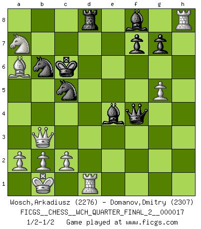 Last move : 1/2-1/2 2017 January 31 11:52:45 [Event "FICGS__CHESS__WCH_QUARTER_FINAL_2__000017"] [Site "FICGS"] [Date "2016.11.02"] [Round "4"] [White "Wosch,Arkadiusz"] [Black "Domanov,Dmitry"] [Result "1/2-1/2"] [WhiteElo "2276"] [BlackElo "2307"] 1.e4 c5 2.Nf3 d6 3.d4 cxd4 4.Nxd4 Nf6 5.Nc3 a6 6.Be3 e6 7.f3 b5 8.Qd2 Nbd7 9.g4 b4 10.Nce2 h6 11.O-O-O Qc7 12.h4 d5 13.Bf4 e5 14.Bh2 dxe4 15.g5 hxg5 16.hxg5 Rxh2 17.Rxh2 exd4 18.Rh8 Nd5 19.Qxd4 Bb7 20.fxe4 N5b6 21.Qxb4 O-O-O 22.Qb3 Bxe4 23.Nc3 Qf4+ 24.Kb1 Kc7 25.Bxa6 Nc5 26.Nb5+ Kc6 27.Na7+ Kc7 28.Nb5+ Kc6 29.Na7+ 1/2-1/2 Sicilian : Najdorf, Byrne (English) attack Queenside Castling by player White (move 11) Queenside Castling by player Black (move 21) This chess game ended in a draw. Follow this game move after move (download)My style is somewhere between that of Tal and Petrosian. (Reshevsky) Moralische Siege zählen nicht. (Savielly Grigorievitsch Tartakower) Cuando me preguntan: -¿Cual es el secreto que te hace hacer mejores movidas que tus oponentes?, Yo respondo: Me da gusto que me pregunten eso, porque, como veran, hay una simple razón. Yo pienso mis propias movidas y dejo a mi oponente que el piense las suyas. (Alexander Alekhine) Nous vivons dans un monde échiquéen : chaque jour qui passe est un défi à relever. (Philosophe Sasha) Difficult things take a long time, impossible things a little longer. (Author unknown)