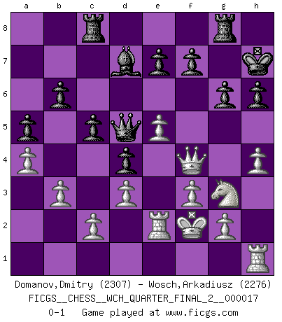 Last move : 0-1 2017 February 11 22:46:36 [Event "FICGS__CHESS__WCH_QUARTER_FINAL_2__000017"] [Site "FICGS"] [Date "2016.11.02"] [Round "5"] [White "Domanov,Dmitry"] [Black "Wosch,Arkadiusz"] [Result "0-1"] [WhiteElo "2307"] [BlackElo "2276"] 1.e4 c5 2.Nf3 Nc6 3.Bb5 g6 4.O-O Bg7 5.Re1 Nf6 6.e5 Nd5 7.Nc3 Nc7 8.Bxc6 dxc6 9.Ne4 Ne6 10.d3 O-O 11.Be3 b6 12.Qd2 Nd4 13.Nxd4 cxd4 14.Bh6 c5 15.h4 Qd5 16.Bxg7 Kxg7 17.Ng3 h6 18.f3 a5 19.a4 Bd7 20.b3 Rac8 21.Qf4 Kh7 22.Kf2 Bc6 23.Re2 Rg8 24.Rh1 Bd7 0-1 Clodomiro Ortiz only on time white could have lost here Sicilian : Nimzovich-Rossolimo attack (with ...g6, without ...d6) Kingside Castling by player White (move 4) Kingside Castling by player Black (move 10) Player Black won this chess game. Follow this game move after move (download)If your opponent cannot do anything active, then don't rush the position; instead you should let him sit there, suffer, and beg you for a draw. (Jeremy Silman) Meine Liebe ist Schach, Schach, Schach. Ich muss jeden Tag Schach spielen, deshalb fühle ich mich so stark. (Miguel Najdorf) El Ajedrez es el juego mas altamente simbólico, pero las agresiones estan por lo tanto aún mas francamente representadas en la partida. Tal vez comenzo como un juego de guerra; Algo como la representación de una batalla en miniatura entre las fuerzas de dos reinos. (Karl Meninger) La guerre est enfant de la passion, la passion est enfant du narcissisme et le narcissisme est l'enfant. (...) Une autre partie ? (Thibault de Vassal) Man with more than one clock never knows what time it is. (Chinese thought)