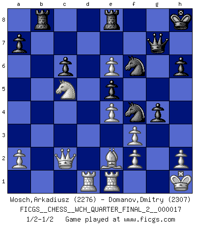 Last move : 1/2-1/2 2017 March 2 18:4:36 [Event "FICGS__CHESS__WCH_QUARTER_FINAL_2__000017"] [Site "FICGS"] [Date "2016.11.02"] [Round "8"] [White "Wosch,Arkadiusz"] [Black "Domanov,Dmitry"] [Result "1/2-1/2"] [WhiteElo "2276"] [BlackElo "2307"] 1.d4 Nf6 2.Nf3 g6 3.c4 Bg7 4.Nc3 O-O 5.e4 d6 6.Be2 e5 7.O-O Nc6 8.d5 Ne7 9.b4 Nh5 10.Re1 f5 11.Ng5 Nf6 12.Bf3 c6 13.Be3 h6 14.Ne6 Bxe6 15.dxe6 g5 16.b5 f4 17.Bc1 Re8 18.Ba3 Ng6 19.c5 dxc5 20.bxc6 bxc6 21.Na4 Kh8 22.Be2 Bf8 23.Bxc5 Qc7 24.Qb3 g4 25.Rad1 Rab8 26.Qc4 f3 27.gxf3 Nf4 28.Kh1 Bxc5 29.Nxc5 Qg7 30.Qc2 Nh3 31.Bf1 Nf4 32.Be2 Nh3 33.Bf1 Nf4 34.Be2 1/2-1/2 King's Indian : East Indian defense Kingside Castling by player Black (move 4) Kingside Castling by player White (move 7) This chess game ended in a draw. Follow this game move after move (download)Only the player with the initiative has the right to attack. (Wilhelm Steinitz) Mit sehr nachdenklichem Gesicht schreitet Bobby durch den Turniersaal. Was ist passiert?, fragt Lombardy. Ich stehe schlecht, antwortet Fischer. Lombardy: Dann biete doch einfach Remis an. Fischer: So schlecht stehe ich nun auch wieder nicht! (Robert James Fischer) Tu sabes, camarada Pachman, no disfruto el ser un Ministro, preferería jugar al Ajedrez como tu. (Che Guevara) Lorsque vous vous retrouvez devant une position atroce, ne tendez pas un ultime piège dérisoire avec l'intention d'abandonner si l'adversaire le déjoue ! Faites-vous plutôt un devoir de résister comme si votre vie en dépendait. Jouez le coup qui vous déplairait au centuple si vous étiez dans la peau de votre tortionnaire ! Unless I accept my faults I will most certainly doubt my virtues. (Hugh Prather)