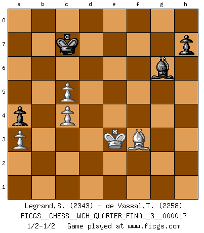 Last move : 1/2-1/2 2017 May 2 7:21:14 [Event "FICGS__CHESS__WCH_QUARTER_FINAL_3__000017"] [Site "FICGS"] [Date "2016.11.02"] [Round "7"] [White "Legrand,Stephane"] [Black "de Vassal,Thibault"] [Result "1/2-1/2"] [WhiteElo "2343"] [BlackElo "2258"] 1.Nf3 Nf6 2.c4 g6 3.Nc3 Bg7 4.g3 O-O 5.Bg2 d6 6.d4 Nbd7 7.O-O e5 8.e4 exd4 9.Nxd4 Re8 10.b3 Nc5 11.f3 c6 12.Be3 d5 13.Nxc6 bxc6 14.Bxc5 Ba6 15.f4 Nxe4 16.Nxe4 dxe4 17.Qxd8 Rexd8 18.Rad1 f5 19.g4 Kf7 20.Bh3 Ke6 21.Kf2 Bf6 22.Rg1 Bb7 23.Ke2 a5 24.Rg3 Rxd1 25.gxf5+ gxf5 26.Kxd1 a4 27.b4 Rd8+ 28.Kc2 Bd4 29.Bxd4 Rxd4 30.Bf1 c5 31.bxc5 Kd7 32.Rg7+ Kc8 33.Re7 Bc6 34.a3 Bd7 35.Be2 e3 36.Rxe3 Rxf4 37.Rh3 Rf2 38.Kd3 f4 39.Rf3 Bf5+ 40.Kd2 Rxh2 41.Rxf4 Bg6 42.Ke3 Rh3+ 43.Rf3 Rxf3+ 44.Bxf3 Kc7 1/2-1/2 Reti Opening Kingside Castling by player Black (move 4) Kingside Castling by player White (move 7) 10 pieces endgame at move 43 : White KBPPP , Black KRBPP WHITE : King + 1 Bishop 3 Pawns BLACK : King + 1 Rook 1 Bishop 2 Pawns 9 pieces endgame at move 44 : White KBPPP , Black KBPP WHITE : King + 1 Bishop 3 Pawns BLACK : King + 1 Bishop 2 Pawns This chess game ended in a draw. Follow this game move after move (download)Of Chess it has been said that life is not long enough for it, but that is the fault of life, not Chess. (William Ewart Napier) Schach ist eine Sache der genauen Beurteilung, wann man zuschlagen und wann man sich ducken muss. (Robert James Fischer) En manos de Fischer's, una diminuta ventaja teórica es tan buena como tener una Reina de ventaja. (Isaac Kashdan) Comme les marins qui ont mille raisons différentes d'aller en mer, les joueurs d'échecs en ont tout autant avant de s'installer devant une table et jouer... (Vincent Bertignac, philosophe) To send light into the darkness of men's hearts - such is the duty of the artist. (Schumann)