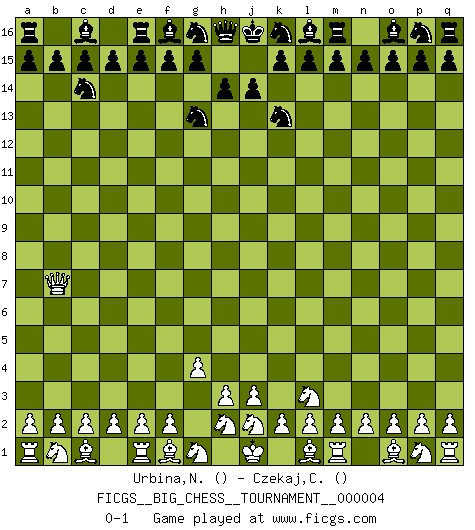 Last move : 0-1 2007 May 9 2:15:32 [Event "FICGS__BIG_CHESS__TOURNAMENT__000004"] [Site "FICGS"] [Date "2007.03.30"] [Round "1"] [White "Urbina,Nathalia"] [Black "Czekaj,Christophe"] [Result "0-1"] [WhiteElo ""] [BlackElo ""] 1.g2-g4 b16-c14 2.h1-b7 h15-g13 3.k1-l3 j15-k13 0-1 This big chess game has been lost on time (started : 2007.03.30 22:20:0) Follow this game move after move (download)Personally, I rather look forward to a computer program winning the world Chess Championship. Humanity needs a lesson in humility. (Richard Dawkings) Ich würde mich als ganz normalen Jungen bezeichnen [Im Alter von 12]. (Sergej Karjakin) El Ajedrez es una manera fabulosa para que los niños aprendan a autovalorarse y a autoestimarse. (Saudin Robovic) Les Echecs ont trois composantes : le temps, l'espace et le matériel en dernier. (Mikhail Tal) Luck is when opportunity knocks and you answer. (Anonymous)