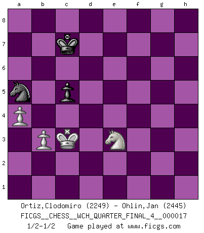 Last move : 1/2-1/2 2017 January 20 9:17:24 [Event "FICGS__CHESS__WCH_QUARTER_FINAL_4__000017"] [Site "FICGS"] [Date "2016.11.02"] [Round "4"] [White "Ortiz,Clodomiro"] [Black "Ohlin,Jan"] [Result "1/2-1/2"] [WhiteElo "2249"] [BlackElo "2445"] 1.d4 Nf6 2.c4 g6 3.Nc3 Bg7 4.e4 d6 5.f3 O-O 6.Nge2 c5 7.Be3 Nc6 8.d5 Ne5 9.Ng3 h5 10.Be2 h4 11.Nf1 e6 12.Bg5 h3 13.Ne3 hxg2 14.Rg1 Qa5 15.Qd2 Nh7 16.h4 f5 17.Be7 Rf7 18.Bxd6 Qd8 19.Bxe5 Qxh4+ 20.Kd1 Bxe5 21.Kc2 fxe4 22.Rxg2 exf3 23.Rxg6+ Bg7 24.dxe6 Bxe6 25.Rxe6 fxe2 26.Ned5 Qxc4 27.Re4 Bxc3 28.Nxc3 Qa6 29.Rg1+ Kh8 30.Rxe2 Raf8 31.Qe1 Rf3 32.Kb1 Qf6 33.Re8 b6 34.Ka1 Rxe8 35.Qxe8+ Nf8 36.Qh5+ Nh7 37.Qh1 Rf2 38.Rd1 Kg8 39.Qa8+ Nf8 40.Rb1 Qf3 41.Qxa7 Rf1 42.Qxb6 Rxb1+ 43.Nxb1 Qf5 44.Qd8 Kf7 45.a4 Ne6 46.Qd7+ Kf6 47.Qd6 Qe5 48.Qa6 Ke7 49.Nc3 Nd4 50.Qb7+ Kd8 51.Ka2 Qe6+ 52.Nd5 Nc6 53.Qb3 Kd7 54.Nb6+ Ke7 55.Qxe6+ Kxe6 56.Kb3 Kd6 57.Kc4 Na7 58.Kd3 Kc6 59.Nc4 Kd5 60.Ne3+ Kc6 61.Ke4 Kd6 62.Nc4+ Ke6 63.Na5 Kd6 64.Kd3 Kd5 65.Nc4 Nc8 66.Ne3+ Kc6 67.Nc4 Kd5 68.Kc3 Na7 69.Na3 Nc6 70.Nc2 Na5 71.Ne3+ Kc6 72.b3 Kc7 73.Nd5+ Kb7 74.Kc2 Kc6 75.Ne3 Kb7 76.Kc3 Kc7 77.Nd1 Kc6 78.Nb2 Kd5 79.Nc4 Nc6 80.Nb6+ Kd6 81.Kd3 Ne5+ 82.Ke4 Nc6 83.Nc4+ Ke6 84.Kd3 Kd5 85.Ne3+ Kd6 86.Kc4 Na5+ 87.Kc3 Kc7 1/2-1/2 King's Indian : Saemisch, 5...O-O Kingside Castling by player Black (move 5) 10 pieces endgame at move 42 : White KQNPP , Black KQRNP WHITE : King + 1 Queen 1 Knight 2 Pawns BLACK : King + 1 Queen 1 Rook 1 Knight 1 Pawn 9 pieces endgame at move 43 : White KQNPP , Black KQNP WHITE : King + 1 Queen 1 Knight 2 Pawns BLACK : King + 1 Queen 1 Knight 1 Pawn 8 pieces endgame at move 55 : White KQNPP , Black KNP WHITE : King + 1 Queen 1 Knight 2 Pawns BLACK : King + 1 Knight 1 Pawn 7 pieces endgame at move 55 : White KNPP , Black KNP WHITE : King + 1 Knight 2 Pawns BLACK : King + 1 Knight 1 Pawn This chess game ended in a draw. Follow this game move after move (download)Suddenly it was obvious to me in my analysis I had missed what Fischer had found with the greatest of ease at the board. (Mikhail Botvinnik) Ein Isolani verdüstert die Stimmung auf dem ganzen Schachbrett. (Savielly Grigorievitsch Tartakower) Nada excita más a Grandes Maestros aburridos que una novedad teórica. (Dominic Lawson) A ce moment-là, je menaçais de comprendre la position ! (Clément L'Heureux) For to win one hundred victories in one hundred battles is not the acme of skill. To subdue the enemy without fighting is the acme of skill. (Sun Tzu)