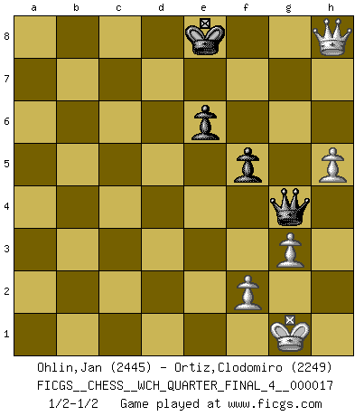 Last move : 1/2-1/2 2017 January 20 7:28:33 [Event "FICGS__CHESS__WCH_QUARTER_FINAL_4__000017"] [Site "FICGS"] [Date "2016.11.02"] [Round "7"] [White "Ohlin,Jan"] [Black "Ortiz,Clodomiro"] [Result "1/2-1/2"] [WhiteElo "2445"] [BlackElo "2249"] 1.d4 Nf6 2.Nf3 d5 3.c4 c6 4.g3 dxc4 5.Bg2 b5 6.O-O Bb7 7.Ne5 e6 8.b3 cxb3 9.axb3 Qb6 10.Nc3 a5 11.Bg5 Bb4 12.Rc1 O-O 13.Bxf6 gxf6 14.Nd3 Bxc3 15.Rxc3 Qxd4 16.Qc1 f5 17.Rd1 Qf6 18.e4 Na6 19.e5 Qg7 20.Nf4 Qxe5 21.Nh5 f4 22.Bf3 Rfd8 23.Re1 Qd6 24.Qa1 Kf8 25.Nxf4 Qd4 26.Re4 Qh8 27.Qxa5 Rd7 28.Kg2 Nc7 29.Qb4+ Ke8 30.Rce3 Kd8 31.Re5 Nd5 32.Nxd5 cxd5 33.Rh5 Bc6 34.Rc3 Ra6 35.Rc5 Qg7 36.Qf4 Rc7 37.b4 Kc8 38.Be2 d4 39.Bf3 f5 40.Rg5 Qh8 41.Bxc6 Raxc6 42.Rxb5 Ra6 43.Rc5 Rxc5 44.bxc5 Ra7 45.Qd6 Qe8 46.Qxd4 h6 47.Rg7 Qc6+ 48.Kg1 Rxg7 49.Qxg7 Qxc5 50.Qxh6 Kd7 51.h4 Qd4 52.h5 Qg4 53.Qh7+ Ke8 54.Qh8+ 1/2-1/2 Queen's pawn game Kingside Castling by player White (move 6) Kingside Castling by player Black (move 12) 10 pieces endgame at move 49 : White KQPPP , Black KQPPP WHITE : King + 1 Queen 3 Pawns BLACK : King + 1 Queen 3 Pawns 9 pieces endgame at move 50 : White KQPPP , Black KQPP WHITE : King + 1 Queen 3 Pawns BLACK : King + 1 Queen 2 Pawns This chess game ended in a draw. Follow this game move after move (download)There just isn't enough televised Chess. (David Letterman) Kein Großmeister ist normal. Sie unterscheiden sich nur im Ausmaß Ihrer Verrücktheit. (Viktor Kortschnoi) Tu sabes, camarada Pachman, no disfruto el ser un Ministro, preferería jugar al Ajedrez como tu. (Che Guevara) Les écrivains ont utilisé les échecs pour analyser les côtés extrêmes de la nature humaine. Dans ce cadre, les échecs offrent un champ d'expérimentation idéal. Mais on pourrait faire la même chose avec la peinture. Et là, en vous référant à Van Gogh, vous ne tirerez pas de conclusion définitive sur les peintres. (Gary Kasparov) Chess, like love, like music, has the power to make people happy. (Siegbert Tarrasch)