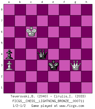 Last move : 1/2-1/2 2016 November 2 11:45:48 [Event "FICGS__CHESS__LIGHTNING_BRONZE__000711"] [Site "FICGS"] [Date "2016.11.02"] [Round "1"] [White "Teverovski,Bogoljub"] [Black "Cirulis,Ilmars"] [Result "1/2-1/2"] [WhiteElo "2040"] [BlackElo "2033"] 1.d4 e6 2.g3 d5 3.Bg2 Be7 4.c4 c6 5.Nf3 Nf6 6.O-O Nbd7 7.Qc2 O-O 8.Nbd2 b6 9.e4 Bb7 10.e5 Ne8 11.cxd5 cxd5 12.Re1 Rc8 13.Qa4 Nc7 14.a3 Ba6 15.Bf1 Bxf1 16.Nxf1 b5 17.Qc2 a6 18.Qd3 Nb8 19.Ne3 Na8 20.b3 Nb6 21.Nd2 Nc6 22.f4 Nc4 23.Nf3 Nxe3 24.Bxe3 Qd7 25.Bd2 Rc7 26.Rec1 Ra8 27.Kg2 g6 28.Rc2 Qc8 29.Qe3 a5 30.g4 R8a7 31.Qd3 Rab7 32.h3 a4 33.b4 Na7 34.Rac1 Rc4 35.Bc3 Rbc7 36.Nd2 R4c6 37.Kg3 Qa6 38.Bb2 Nc8 39.f5 Rxc2 40.Rxc2 Rxc2 41.Qxc2 exf5 42.gxf5 gxf5 43.Qxf5 Qc6 44.Nf3 Qg6+ 45.Qg4 Nb6 46.Bc1 Nc4 47.h4 f5 48.Qxg6+ hxg6 49.h5 Kg7 50.h6+ Kh7 51.Kh3 f4 52.Kg4 Kxh6 53.Kxf4 Kh5 54.Kg3 Bf8 55.Ne1 g5 56.Ng2 Bh6 57.Ne3 g4 58.Nxc4 dxc4 59.e6 Bf8 60.Bd2 Bd6+ 61.Bf4 Bxf4+ 62.Kxf4 Kg6 63.Ke5 c3 64.Kd6 c2 65.e7 c1Q 66.e8Q+ Kf5 67.Qxb5+ Kf4 68.Qe5+ Kf3 69.Qf5+ Qf4+ 70.Qxf4+ Kxf4 71.b5 g3 72.b6 g2 73.b7 g1Q 74.b8Q Qxd4+ 75.Kc6 Ke3 76.Qg3+ 1/2-1/2 Queen's pawn Kingside Castling by player White (move 6) Kingside Castling by player Black (move 7) 10 pieces endgame at move 62 : White KPPPP , Black KPPPP WHITE : King + 4 Pawns BLACK : King + 4 Pawns Promotion Queen by player Black (move 65) Promotion Queen by player White (move 66) 9 pieces endgame at move 67 : White KQPPP , Black KQPP WHITE : King + 1 Queen 3 Pawns BLACK : King + 1 Queen 2 Pawns 8 pieces endgame at move 70 : White KQPPP , Black KPP WHITE : King + 1 Queen 3 Pawns BLACK : King + 2 Pawns 7 pieces endgame at move 70 : White KPPP , Black KPP WHITE : King + 3 Pawns BLACK : King + 2 Pawns Promotion Queen by player Black (move 73) Promotion Queen by player White (move 74) 6 pieces endgame at move 74 : White KQP , Black KQP WHITE : King + 1 Queen 1 Pawn BLACK : King + 1 Queen 1 Pawn This chess game ended in a draw. Follow this game move after move (download)A good sacrifice is one that is not necessarily sound but leaves your opponent dazed and confused. (Rudolph Spielmann) Frage des Reporters: -Worin besteht das Ziel von Gambiteröffnungen? Antwort: -Auf Kosten der Partie einen Ruf als Angriffspieler zu erwerben.- (Siegbert Tarrasch) Después de la respuesta de las negras a 1.e4 con 1..e5, se quedan siempre tratando de entrar dentro del juego. (Howard Staunton) Karpov est une pièce de musée. (Garry Kasparov) There's no money in correspondence chess. (John Knudsen)