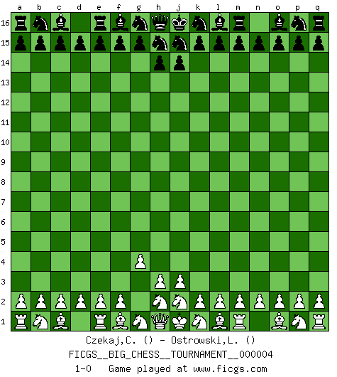 Last move : 1-0 2007 April 30 1:10:50 [Event "FICGS__BIG_CHESS__TOURNAMENT__000004"] [Site "FICGS"] [Date "2007.03.30"] [Round "1"] [White "Czekaj,Christophe"] [Black "Ostrowski,Leszek"] [Result "1-0"] [WhiteElo ""] [BlackElo ""] 1.g2-g4 1-0 This big chess game has been lost on time (started : 2007.03.30 22:20:0) Follow this game move after move (download)Checkers is for tramps. (Paul Morphy) Capablanka war das größte Genie der Schachgeschichte! Aber denken sie nicht er habe nichts vom Schach verstanden. Er wusste nur soviel wie er wissen musste um seine Ziele zu erreichen. (Mikhail Moiseyevich Botvinik) La vida es como un juego de Ajedrez, cambiando con cada movimiento. (Proverbio Chino) Psychologiquement, tu dois avoir confiance en toi même, mais cette confiance doit être basée sur des faits. (Robert Fischer) Ah, beer! The cause of, and the solution to, all of life's problems. (Homer Simpson)