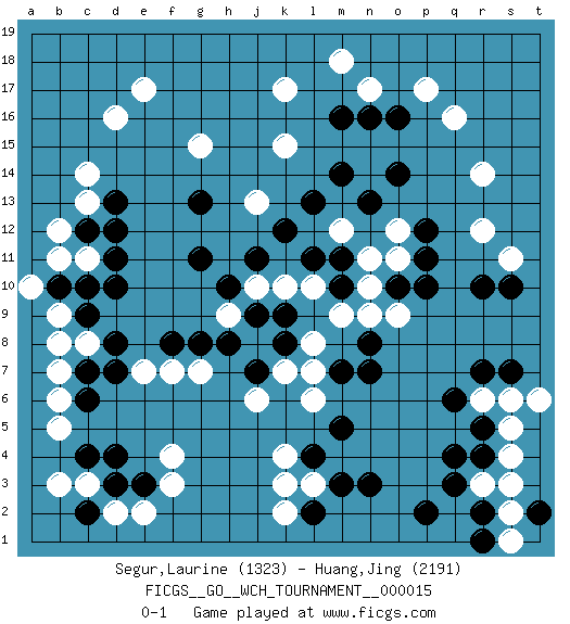 Last move : 0-1 2017 May 12 14:31:54 [Event "FICGS__GO__WCH_TOURNAMENT__000015"] [Site "FICGS"] [Date "2016.11.04"] [Round "1"] [Black "Segur,Laurine"] [White "Huang,Jing"] [Result "0-1"] [Rating 1 "1323"] [Rating 2 "2191"] 1.d4 d16 2.q4 q16 3.r7 f3 4.e3 f4 5.c7 k3 6.n3 r14 7.l2 k2 8.r10 c14 9.d10 k17 10.m16 k15 11.o16 p17 12.o14 o12 13.m14 m12 14.l13 j13 15.k12 k10 16.j11 h9 17.g11 e17 18.l4 l3 19.m3 k4 20.m5 l6 21.n7 c3 22.c4 e2 23.d3 d2 24.c2 e7 25.g13 b11 26.b10 c11 27.o10 r3 28.q3 s4 29.r2 s2 30.r1 s1 31.p2 s6 32.r5 s5 33.r4 s3 34.s7 r6 35.q6 g15 36.d13 c13 37.d12 r12 38.p12 o11 39.p11 n10 40.l11 m9 41.m10 o9 42.p10 l10 43.m11 n11 44.n13 m18 45.n8 n9 46.f8 f7 47.g8 g7 48.k8 l8 49.j9 k7 50.h8 s11 51.s10 n17 52.n16 b9 53.c10 c8 54.d8 b7 55.d7 a10 56.c12 b12 57.d11 b5 58.c6 b6 59.c9 b8 60.t2 t6 61.j7 j6 62.m7 l7 63.k9 j10 64.h10 b3 0-1 Here are the names of the openings (joseki) played in the four corners : Corner d4 : d4 f3 Hoshi (Hwajeom, Seongjeom, Xingwei`) 4-4 Point. The star or hoshi (4-4) point, emphasizing influence at the potential expense of territory. Ikken Kakari (Hankan Keolch'im, Yi Gua`jiao~, 1-Space Low Approach). White 2 is the standard approach move to the 4-4. Player White won this Go (weiqi, baduk) game. Follow this game move after move (download)Six eyes in a rectangle are alive. (Anonymous) There is a great deal of difference between an eager man who wants to read a book and a tired man who wants a book to read. (G.K. Chesterton)