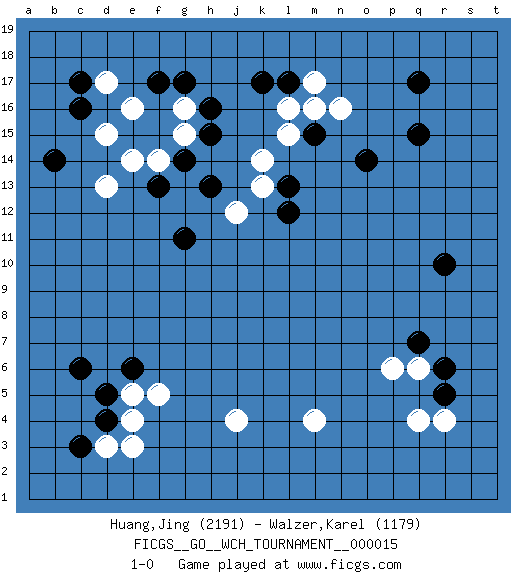 Last move : 1-0 2017 February 1 17:16:25 [Event "FICGS__GO__WCH_TOURNAMENT__000015 "] [Site "FICGS"] [Date "2016.11.04"] [Round "1"] [Black "Huang,Jing "] [White "Walzer,Karel "] [Result "1-0"] [Rating 1 "2191"] [Rating 2 "1179"] 1.q17 d3 2.c16 q4 3.r6 q6 4.q7 p6 5.r5 r4 6.r10 m4 7.d5 e5 8.e6 f5 9.d4 e4 10.c3 e3 11.c6 j4 12.q15 e16 13.g17 d17 14.c17 g16 15.h16 g15 16.f17 d15 17.b14 d13 18.h15 n16 19.l17 l16 20.k17 m17 21.m15 m16 22.o14 l15 23.l13 k14 24.g14 f14 25.h13 k13 26.l12 j12 27.f13 e14 28.g11 1-0 Here are the names of the openings (joseki) played in the four corners : Corner q4 : q4 r6Hoshi (Hwajeom, Seongjeom, Xingwei`) 4-4 Point. The star or hoshi (4-4) point, emphasizing influence at the potential expense of territory.Ikken Kakari (Hankan Keolch'im, Yi Gua`jiao~, 1-Space Low Approach). Black 2 is the standard approach move to the 4-4. Corner d4 : d3 d5Komoku (Somok, Xiao~mu`) 3-4 Point. The komoku (3-4) point is the traditional corner enclosure move..Ikken Takagakari (Hankan Nop'dakeolch'im, Yi Gaogua`jiao~, 1-Space High Approach). The 5-4 approach move has become more popular in modern times, as modern Go emphasizes speed and influence. Corner d16 : c16 e16Komoku (Somok, Xiao~mu`) 3-4 Point. The komoku (3-4) point is the traditional corner enclosure move..Ikken Takagakari (Hankan Nop'dakeolch'im, Yi Gaogua`jiao~, 1-Space High Approach). The 5-4 approach move has become more popular in modern times, as modern Go emphasizes speed and influence. Player Black won this Go (weiqi, baduk) game.Follow this game move after move (download ) Avoid the plate connection. (Anonymous) Players are not good because they find tactics, it is about the way to find the positions in which those tactics are hidden. (Luc-Olivier Leclerc)