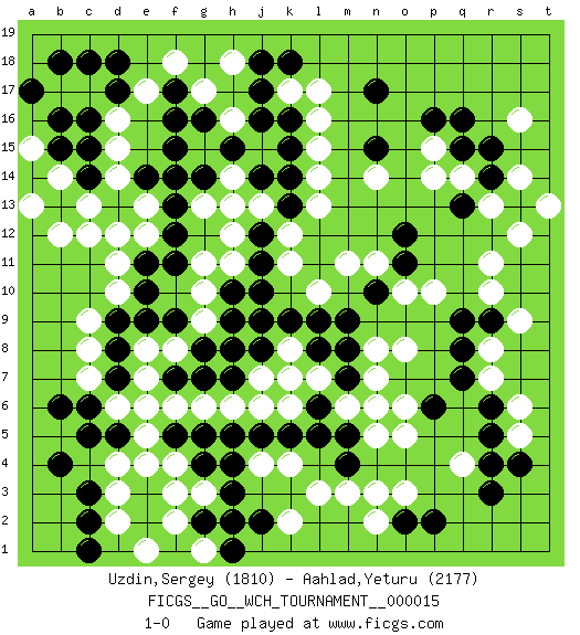 Last move : 1-0 2017 July 27 22:45:46 [Event "FICGS__GO__WCH_TOURNAMENT__000015"] [Site "FICGS"] [Date "2016.11.04"] [Round "1"] [Black "Uzdin,Sergey"] [White "Aahlad,Yeturu"] [Result "1-0"] [Rating 1 "1810"] [Rating 2 "2177"] 1.q16 q4 2.d17 d4 3.c15 k17 4.n17 g17 5.r6 o3 6.s4 r7 7.q7 r8 8.q8 s6 9.r5 r10 10.q9 r11 11.r3 l3 12.c6 f4 13.b4 c7 14.d7 c8 15.c3 d6 16.b6 c13 17.h4 g6 18.j5 j7 19.l5 o6 20.m4 n3 21.m7 o8 22.p6 o5 23.m9 n8 24.m8 s5 25.r4 o10 26.p2 m11 27.j9 h8 28.h9 g9 29.d8 c9 30.d9 d10 31.f9 g10 32.e10 d11 33.e11 e12 34.f11 h11 35.f12 k4 36.k5 g3 37.h3 e6 38.f14 e13 39.f13 d15 40.f16 d16 41.f17 k8 42.k9 m6 43.l6 l7 44.n6 n7 45.m5 k11 46.g2 f2 47.j2 g15 48.f15 k2 49.g4 f3 50.f7 f8 51.g7 e7 52.g8 e8 53.h7 h6 54.j8 f6 55.h8 j6 56.e9 g1 57.h1 h2 58.n10 n11 59.g2 d3 60.o11 p10 61.o12 l10 62.l9 j13 63.j12 h12 64.h10 g11 65.j11 k12 66.j10 h14 67.k13 l13 68.k14 l14 69.k15 l15 70.f1 d2 71.c2 e1 72.g5 n5 73.f5 e5 74.c5 g1 75.h15 j15 76.k16 l16 77.h13 g13 78.j16 h16 79.j17 f18 80.k18 h18 81.j14 h13 82.h15 l17 83.j18 m6 84.g14 j15 85.g16 n6 86.c16 p15 87.q15 p14 88.p16 q14 89.n15 n14 90.b13 b14 91.c14 b12 92.d13 c12 93.b15 d14 94.r9 e17 95.d18 c17 96.c18 b17 97.b18 a13 98.a17 a15 99.b16 s9 100.r14 r13 101.e14 d12 102.o2 n2 103.s13 s14 104.r15 s12 105.q13 t13 106.k7 k6 107.d5 e4 108.h15 s16 109.h2 j4 110.h5 m3 111.l8 k7 112.c1 1-0 Here are the names of the openings (joseki) played in the four corners : Corner q4 : q4 r6 Hoshi (Hwajeom, Seongjeom, Xingwei`) 4-4 Point. The star or hoshi (4-4) point, emphasizing influence at the potential expense of territory. Ikken Kakari (Hankan Keolch'im, Yi Gua`jiao~, 1-Space Low Approach). Black 2 is the standard approach move to the 4-4. Corner d4 : d4 c6 Hoshi (Hwajeom, Seongjeom, Xingwei`) 4-4 Point. The star or hoshi (4-4) point, emphasizing influence at the potential expense of territory. Ikken Kakari (Hankan Keolch'im, Yi Gua`jiao~, 1-Space Low Approach). Black 2 is the standard approach move to the 4-4. Player Black won this Go (weiqi, baduk) game. Follow this game move after move (download)The simplest move is the best move. (Anonymous) Without deviation from the norm, progress is not possible. (Frank Zappa)