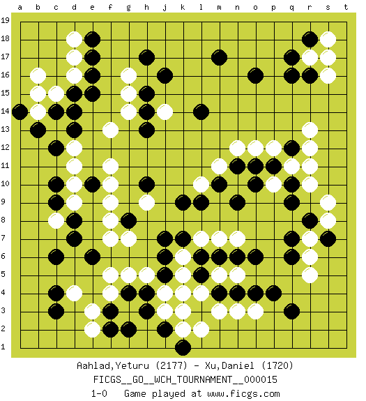 Last move : 1-0 2017 April 5 11:19:18 [Event "FICGS__GO__WCH_TOURNAMENT__000015"] [Site "FICGS"] [Date "2016.11.04"] [Round "1"] [Black "Aahlad,Yeturu"] [White "Xu,Daniel"] [Result "1-0"] [Rating 1 "2177"] [Rating 2 "1720"] 1.q16 d4 2.q3 d16 3.f3 j4 4.c6 f4 5.g4 f5 6.c3 e3 7.c4 g3 8.f2 e2 9.h3 g5 10.g2 j3 11.j2 c8 12.h4 h5 13.j5 l4 14.j6 k2 15.k1 l2 16.l5 m5 17.m4 m3 18.n4 k5 19.l6 k6 20.k7 k4 21.j7 n3 22.l3 k3 23.m6 n5 24.o4 o3 25.p4 r10 26.r8 r13 27.d8 f7 28.c9 f9 29.q12 r12 30.q10 q11 31.p11 r11 32.q9 s8 33.s7 s9 34.h10 f11 35.h13 p10 36.o10 n7 37.n6 r7 38.q7 r6 39.q6 r5 40.e10 f10 41.g8 f8 42.d13 f13 43.d15 c15 44.e15 c13 45.c14 b14 46.d14 b16 47.e16 d17 48.e17 d12 49.c12 d11 50.b13 d9 51.c10 d10 52.d7 g7 53.m17 l7 54.k9 l10 55.l9 m7 56.o6 n10 57.n11 m11 58.n9 n12 59.m10 p12 60.o11 o12 61.o16 r17 62.r16 s16 63.q17 s18 64.r18 s17 65.l14 j14 66.j16 d18 67.e18 g14 68.a14 b15 69.h14 g16 70.h15 g15 71.e6 h9 72.h17 1-0 Here are the names of the openings (joseki) played in the four corners : Corner d4 : d4 f3 Hoshi (Hwajeom, Seongjeom, Xingwei`) 4-4 Point. The star or hoshi (4-4) point, emphasizing influence at the potential expense of territory. Ikken Kakari (Hankan Keolch'im, Yi Gua`jiao~, 1-Space Low Approach). Black 2 is the standard approach move to the 4-4. Corner q4 : q3 l4 Komoku (Somok, Xiao~mu`) 3-4 Point. The komoku (3-4) point is the traditional corner enclosure move.. Corner q16 : q16 r13 Hoshi (Hwajeom, Seongjeom, Xingwei`) 4-4 Point. The star or hoshi (4-4) point, emphasizing influence at the potential expense of territory. Niken Kakari (Dukan Keolch'im, E`r Gua`jiao~, 2-Space Low Approach). Black typically answers by 7-3 or 3-5 (which is not joseki). Player Black won this Go (weiqi, baduk) game. Follow this game move after move (download)Extend one hand from the cutting points. (Anonymous) Think like a man of action, act like a man of thought. (Henri Louis Bergson)