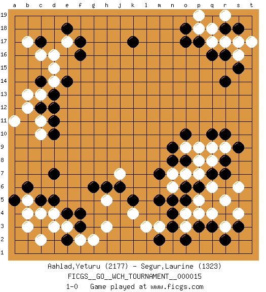 Last move : 1-0 2017 May 2 22:59:9 [Event "FICGS__GO__WCH_TOURNAMENT__000015"] [Site "FICGS"] [Date "2016.11.04"] [Round "1"] [Black "Aahlad,Yeturu"] [White "Segur,Laurine"] [Result "1-0"] [Rating 1 "2177"] [Rating 2 "1323"] 1.q16 d4 2.q3 d16 3.f3 e3 4.f4 l3 5.n3 h3 6.d5 c4 7.c5 b5 8.b6 b3 9.a5 b4 10.d7 r5 11.r7 r3 12.r2 q4 13.p3 p4 14.s3 s4 15.f17 e17 16.f16 c13 17.c17 c16 18.e18 b17 19.e2 c2 20.e4 d3 21.r10 c10 22.k17 r17 23.r16 q17 24.p17 p18 25.o17 s16 26.s15 t17 27.s18 s17 28.o18 p19 29.r18 q18 30.r14 r19 31.m5 o3 32.o2 o4 33.m2 m3 34.n4 h5 35.g6 j7 36.k5 k4 37.h6 g2 38.j6 f2 39.d11 p7 40.d10 c11 41.d13 d14 42.c12 b12 43.d12 a11 44.c14 b13 45.e14 d15 46.n8 n7 47.m7 n6 48.o8 q8 49.r8 q9 50.q10 r9 51.s9 s6 52.q7 p8 53.p6 o7 54.o5 q6 55.n5 p5 56.o6 p9 57.o10 o9 58.n9 1-0 Here are the names of the openings (joseki) played in the four corners : Corner d4 : d4 f3 Hoshi (Hwajeom, Seongjeom, Xingwei`) 4-4 Point. The star or hoshi (4-4) point, emphasizing influence at the potential expense of territory. Ikken Kakari (Hankan Keolch'im, Yi Gua`jiao~, 1-Space Low Approach). Black 2 is the standard approach move to the 4-4. Corner q4 : q3 l3 Komoku (Somok, Xiao~mu`) 3-4 Point. The komoku (3-4) point is the traditional corner enclosure move.. Corner d16 : d16 f17 Hoshi (Hwajeom, Seongjeom, Xingwei`) 4-4 Point. The star or hoshi (4-4) point, emphasizing influence at the potential expense of territory. Ikken Kakari (Hankan Keolch'im, Yi Gua`jiao~, 1-Space Low Approach). Black 2 is the standard approach move to the 4-4. Corner q16 : q16 r17 Hoshi (Hwajeom, Seongjeom, Xingwei`) 4-4 Point. The star or hoshi (4-4) point, emphasizing influence at the potential expense of territory. Player Black won this Go (weiqi, baduk) game. Follow this game move after move (download)... {it is} something unearthly... if there are sentient beings on other planets, then they play go. (Emanuel Lasker, chess world champion) There are two types of people in this world, good and bad. The good sleep better, but the bad seem to enjoy the waking hours much more. (Woody Allen)