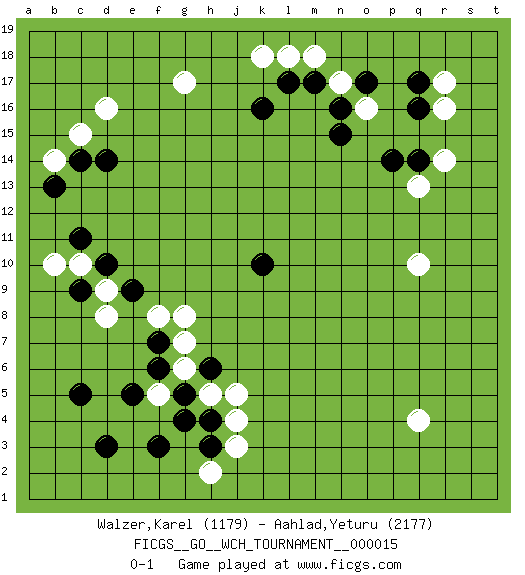 Last move : 0-1 2017 January 7 8:1:27 [Event "FICGS__GO__WCH_TOURNAMENT__000015"] [Site "FICGS"] [Date "2016.11.04"] [Round "1"] [Black "Walzer,Karel"] [White "Aahlad,Yeturu"] [Result "0-1"] [Rating 1 "1179"] [Rating 2 "2177"] 1.d3 d16 2.q16 q4 3.c5 j3 4.h4 j4 5.h3 h5 6.g5 g6 7.h6 j5 8.f6 g7 9.f7 g8 10.g4 q10 11.k16 r14 12.q14 q13 13.p14 r17 14.q17 r16 15.c14 g17 16.d10 c15 17.d14 b14 18.b13 k18 19.l17 n17 20.n16 o16 21.n15 l18 22.m17 m18 23.o17 f8 24.k10 f5 25.e5 h2 26.f3 d9 27.c9 c10 28.c11 b10 29.e9 d8 0-1 Here are the names of the openings (joseki) played in the four corners : Corner q16 : q16 r14 Hoshi (Hwajeom, Seongjeom, Xingwei`) 4-4 Point. The star or hoshi (4-4) point, emphasizing influence at the potential expense of territory. Ikken Kakari (Hankan Keolch'im, Yi Gua`jiao~, 1-Space Low Approach). White 2 is the standard approach move to the 4-4. Corner d16 : d16 c14 Hoshi (Hwajeom, Seongjeom, Xingwei`) 4-4 Point. The star or hoshi (4-4) point, emphasizing influence at the potential expense of territory. Ikken Kakari (Hankan Keolch'im, Yi Gua`jiao~, 1-Space Low Approach). Black 2 is the standard approach move to the 4-4. Player White won this Go (weiqi, baduk) game. Follow this game move after move (download)When you study joseki, you lose two stones in strength. (Anonymous) Those who make the worst use of their time are the first to complain of its brevity. (Jean de la Bruyere)