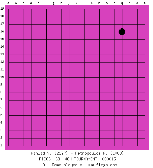 Last move : 1-0 2016 November 6 16:39:51 [Event "FICGS__GO__WCH_TOURNAMENT__000015"] [Site "FICGS"] [Date "2016.11.04"] [Round "1"] [Black "Aahlad,Yeturu"] [White "Petropoulos,Athanasios"] [Result "1-0"] [Rating 1 "2177"] [Rating 2 "1000"] 1.q16 1-0 Here are the names of the openings (joseki) played in the four corners : Player Black won this Go (weiqi, baduk) game. Follow this game move after move (download)The strong player plays straight, the weak diagonally. (Anonymous) You can think I'm wrong, but that's no reason to quit thinking. (Gregory House, House M.D.)