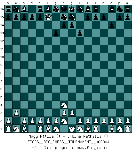 Last move : 1-0 2007 May 13 21:7:27 [Event "FICGS__BIG_CHESS__TOURNAMENT__000004"] [Site "FICGS"] [Date "2007.03.30"] [Round "1"] [White "Nagy,Attila"] [Black "Urbina,Nathalia"] [Result "1-0"] [WhiteElo ""] [BlackElo ""] 1.b2-b3 k15-k13 2.j2-h4 g15-g13 3.h1-o7 o15-o14 4.o7-f15 1-0 This big chess game has been lost on time (started : 2007.03.30 22:20:0) Follow this game move after move (download)Chess is a more highly symbolic game, but the aggressions are therefore even more frankly represented in the play. It probably began as a war game; that is, the representation of a miniature battle between the forces of two kingdoms. (Karl Meninger) Ja, jede Frau in Holland liebt mich bestimmt, und alle Männer hassen mich. (Loek van Wely) Bobby Fischer es el jugador de Ajedrez mas grande que jamás haya existido. (Ken Smith) Je fais ceci parce que dans cinquante coups j'obtiendrai cela; je m'appelle Mikhail Moisevitch Botvinnik. (Botvinnik) Dave, my mind is going. I can feel it. (HAL 9000 in 2001, a space odyssey)