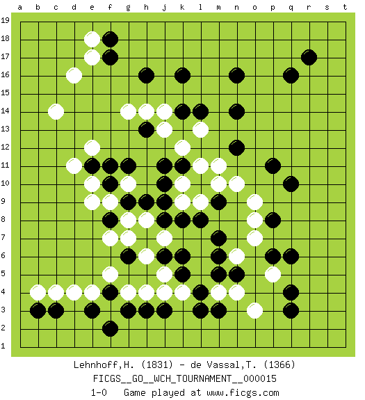 Last move : 1-0 2017 March 27 19:26:27 [Event "FICGS__GO__WCH_TOURNAMENT__000015"] [Site "FICGS"] [Date "2016.11.04"] [Round "1"] [Black "Lehnhoff,Heinz-Georg"] [White "de Vassal,Thibault"] [Result "1-0"] [Rating 1 "1831"] [Rating 2 "1366"] 1.q16 d4 2.q4 d16 3.f17 c14 4.k16 f3 5.q10 o3 6.m3 n4 7.q6 n6 8.j3 k4 9.l3 j4 10.h3 h4 11.g3 g4 12.f2 g14 13.e3 e4 14.f4 f5 15.m5 m4 16.l4 l5 17.m6 o7 18.k5 l6 19.m7 l7 20.l8 k7 21.k8 j7 22.j8 h8 23.h7 j5 24.j6 h6 25.k6 g7 26.h9 g8 27.q3 o9 28.p8 o8 29.p11 p5 30.p6 n10 31.n12 m11 32.n5 k10 33.j10 k12 34.n16 k9 35.j9 g10 36.g9 f9 37.g6 j7 38.f8 f7 39.f10 e9 40.g11 e10 41.h13 l9 42.m9 m10 43.k11 l11 44.j11 l13 45.n14 j14 46.h16 h14 47.r17 e17 48.c3 c4 49.b3 b4 50.f11 e12 51.e11 d11 52.f18 e18 53.k14 j13 54.l14 1-0 Here are the names of the openings (joseki) played in the four corners : Corner d16 : d16 f17 Hoshi (Hwajeom, Seongjeom, Xingwei`) 4-4 Point. The star or hoshi (4-4) point, emphasizing influence at the potential expense of territory. Ikken Kakari (Hankan Keolch'im, Yi Gua`jiao~, 1-Space Low Approach). Black 2 is the standard approach move to the 4-4. Corner q4 : q4 o3 Hoshi (Hwajeom, Seongjeom, Xingwei`) 4-4 Point. The star or hoshi (4-4) point, emphasizing influence at the potential expense of territory. Ikken Kakari (Hankan Keolch'im, Yi Gua`jiao~, 1-Space Low Approach). White 2 is the standard approach move to the 4-4. Player Black won this Go (weiqi, baduk) game. Follow this game move after move (download)The second line is the line of defeat, the third line is the line of territory, and the fourth line is the line of influence. (Anonymous) In every real man a child is hidden that wants to play. (Friedrich Nietzsche)