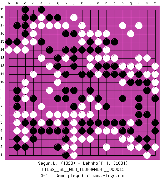 Last move : 0-1 2017 August 7 21:16:14 [Event "FICGS__GO__WCH_TOURNAMENT__000015"] [Site "FICGS"] [Date "2016.11.04"] [Round "1"] [Black "Segur,Laurine"] [White "Lehnhoff,Heinz-Georg"] [Result "0-1"] [Rating 1 "1323"] [Rating 2 "1831"] 1.d4 q16 2.q4 d16 3.r7 c6 4.c5 d6 5.g4 c3 6.d3 b5 7.c2 d11 8.d8 c4 9.d5 f6 10.f5 g6 11.k4 q3 12.r3 k16 13.q10 r12 14.r11 p12 15.c17 d17 16.c16 c15 17.b15 c14 18.c18 b14 19.d18 f17 20.f18 e18 21.e19 e17 22.g18 d19 23.c19 j18 24.a15 r4 25.r5 s4 26.s3 p3 27.p4 s5 28.s6 q5 29.r6 o4 30.p5 l3 31.o5 n4 32.p8 j2 33.g2 g10 34.b8 c9 35.b9 c10 36.b7 b6 37.e6 e7 38.b3 b4 39.b2 e5 40.e4 p17 41.m8 l13 42.n12 n13 43.o12 o13 44.m12 m13 45.k11 c8 46.k8 g17 47.l4 n2 48.j12 k3 49.s12 l12 50.l11 r13 51.j14 h13 52.j13 m11 53.n11 q11 54.p11 q12 55.r10 p10 56.o11 s13 57.h14 s11 58.s10 r2 59.s2 q2 60.h16 s1 61.t4 t2 62.t5 h17 63.j16 k17 64.l14 k15 65.k14 m15 66.m14 n14 67.l15 l16 68.n15 m16 69.o15 r17 70.g8 f9 71.h9 t12 72.f14 j4 73.n5 m4 74.m5 k6 75.k5 j5 76.l5 g5 77.e6 a14 78.b17 e13 79.e15 d15 80.h4 e5 81.f4 j8 82.j7 k7 83.j9 j6 84.h8 n16 85.g13 f12 86.g12 g11 87.h11 t10 88.s9 m7 89.l7 l6 90.n7 l8 91.l9 t9 92.t8 t11 93.r8 h2 94.h3 j3 95.h5 h6 96.h1 j1 0-1 Here are the names of the openings (joseki) played in the four corners : Corner d4 : d4 c6 Hoshi (Hwajeom, Seongjeom, Xingwei`) 4-4 Point. The star or hoshi (4-4) point, emphasizing influence at the potential expense of territory. Ikken Kakari (Hankan Keolch'im, Yi Gua`jiao~, 1-Space Low Approach). White 2 is the standard approach move to the 4-4. Player White won this Go (weiqi, baduk) game. Follow this game move after move (download)Pon-nuki is worth thirty points. (Anonymous) When it is a question of money, everybody is of the same religion. (Voltaire)