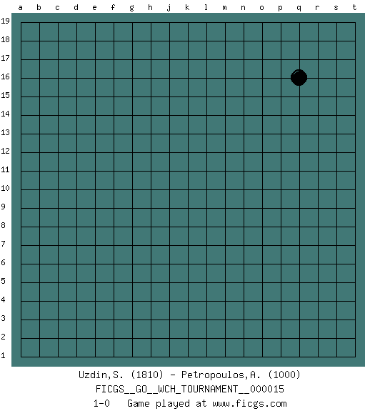 Last move : 1-0 2016 November 6 16:40:16 [Event "FICGS__GO__WCH_TOURNAMENT__000015"] [Site "FICGS"] [Date "2016.11.04"] [Round "1"] [Black "Uzdin,Sergey"] [White "Petropoulos,Athanasios"] [Result "1-0"] [Rating 1 "1810"] [Rating 2 "1000"] 1.q16 1-0 Here are the names of the openings (joseki) played in the four corners : Player Black won this Go (weiqi, baduk) game. Follow this game move after move (download)One point in the center is worth ten in the corner. (Anonymous) Train yourself to let go of everything you fear to lose. (Master Yoda in Star Wars ep.3)