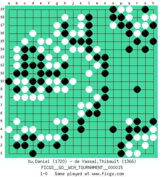 Last move : 1-0 2017 March 27 20:26:49 [Event "FICGS__GO__WCH_TOURNAMENT__000015"] [Site "FICGS"] [Date "2016.11.04"] [Round "1"] [Black "Xu,Daniel"] [White "de Vassal,Thibault"] [Result "1-0"] [Rating 1 "1720"] [Rating 2 "1366"] 1.q16 d4 2.q3 d16 3.r9 o17 4.q14 r17 5.q17 q18 6.p18 s18 7.p17 s15 8.s14 r16 9.r15 p19 10.o19 q19 11.o18 k17 12.k4 q5 13.o4 r3 14.r2 s2 15.r4 s3 16.q4 q2 17.p2 r1 18.s4 g3 19.k15 g17 20.d10 c8 21.c13 c15 22.c3 c4 23.d3 e3 24.e2 f3 25.b4 b3 26.b2 d2 27.c2 b5 28.e13 a4 29.d1 l9 30.n9 l11 31.n11 h9 32.m7 k7 33.l6 e9 34.d9 d8 35.e10 f10 36.f9 e8 37.f11 g10 38.h4 g5 39.h3 b10 40.h17 g16 41.h16 f12 42.e11 f13 43.g11 h13 44.f14 e14 45.d14 e15 46.g13 g12 47.h12 g14 48.e12 f15 49.h10 g9 50.b9 c9 51.b11 c10 52.c11 b14 53.d12 b12 54.c14 b13 55.c12 j16 56.j15 h15 57.l17 k18 58.l18 k16 59.l16 h18 60.m13 j10 61.s16 s17 62.t15 m12 63.n12 m8 64.n8 k6 65.k5 h5 66.p1 q1 67.a10 b8 68.g2 l7 69.m6 t4 70.t5 t3 71.r5 l13 72.l14 m14 73.n13 k14 74.l15 j14 75.t17 t18 76.s19 1-0 Here are the names of the openings (joseki) played in the four corners : Corner q16 : q16 o17 Hoshi (Hwajeom, Seongjeom, Xingwei`) 4-4 Point. The star or hoshi (4-4) point, emphasizing influence at the potential expense of territory. Ikken Kakari (Hankan Keolch'im, Yi Gua`jiao~, 1-Space Low Approach). White 2 is the standard approach move to the 4-4. Player Black won this Go (weiqi, baduk) game. Follow this game move after move (download)There is death in the hane. (Anonymous) I'll be back. (Arnold Schwarzenegger)