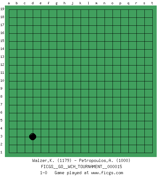 Last move : 1-0 2016 November 10 1:16:50 [Event "FICGS__GO__WCH_TOURNAMENT__000015"] [Site "FICGS"] [Date "2016.11.04"] [Round "1"] [Black "Walzer,Karel"] [White "Petropoulos,Athanasios"] [Result "1-0"] [Rating 1 "1179"] [Rating 2 "1000"] 1.d3 1-0 Here are the names of the openings (joseki) played in the four corners : Corner d4 : d3 1-0 Komoku (Somok, Xiao~mu`) 3-4 Point. The komoku (3-4) point is the traditional corner enclosure move.. Player Black won this Go (weiqi, baduk) game. Follow this game move after move (download)Five groups might live but the six will die. (Anonymous) Big Chess is a place for big hallucinations. (Thibault de Vassal)