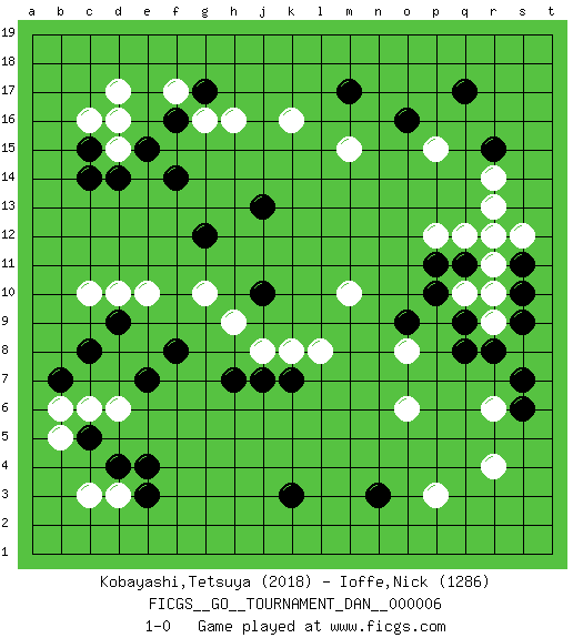 Last move : 1-0 2007 July 15 17:3:32 [Event "FICGS__GO__TOURNAMENT_DAN__000006"] [Site "FICGS"] [Date "2007.03.31"] [Round "1"] [Black "Kobayashi,Tetsuya"] [White "Ioffe,Nick"] [Result "1-0"] [Rating 1 "2018"] [Rating 2 "1286"] 1.r15 d17 2.d4 r4 3.q17 p3 4.c15 d15 5.d14 c16 6.e15 d16 7.c14 c10 8.c8 q10 9.k3 k16 10.f14 e10 11.m17 g16 12.f16 f17 13.g17 h16 14.g12 g10 15.j13 m15 16.j10 d6 17.d9 d10 18.f8 h9 19.h7 j8 20.j7 l8 21.k7 k8 22.n3 p15 23.o16 r14 24.r8 r9 25.q8 r6 26.p10 o8 27.q11 r11 28.q9 r10 29.o9 m10 30.r12 q12 31.p11 p12 32.s11 s12 33.s9 r13 34.s10 r12 35.s7 d3 36.e3 c3 37.e4 b5 38.c5 c6 39.b7 b6 40.e7 o6 41.s6 1-0 This go game has been lost on time (started : 2007.03.31 10:30:25) Here are the names of the openings (joseki) played in the four corners : Corner d16 : d17 c15 Komoku (Somok, Xiao~mu`) 3-4 Point. The komoku (3-4) point is the traditional corner enclosure move.. Ikken Kakari (Hankan Keolch'im, Yi Gua`jiao~, 1-Space Low Pincer). The small knight move is the basic approach move to the 3-4 point stone. It has been continually used for over four centuries. There are limitless variations, with new moves constantly being discovered. Black 2 opens the door to a treaure store of joseki. Player Black won this Go (weiqi, baduk) game. Follow this game move after move (download)You don't have to be really good anymore to get good results. What's happening with chess is that it's gradually losing its place as the par excellence of intellectual activity. Smart people in search of a challenging board game might try a game called Go. (Hans Berliner, The New York Times, 2003) Never risk one's whole fortune unless supported by one's entire army. (Niccolo Machiavelli)