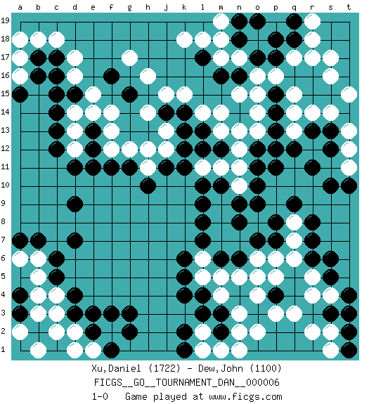 Last move : 1-0 2007 August 28 2:0:44 [Event "FICGS__GO__TOURNAMENT_DAN__000006"] [Site "FICGS"] [Date "2007.03.31"] [Round "1"] [Black "Xu,Daniel"] [White "Dew,John"] [Result "1-0"] [Rating 1 "1722"] [Rating 2 "1100"] 1.q16 r4 2.p4 p3 3.o3 q3 4.d4 d17 5.d15 g17 6.c17 c18 7.c16 b18 8.c12 o4 9.g3 r14 10.r11 o16 11.o17 n17 12.p17 r17 13.r16 s16 14.s15 s17 15.r15 q17 16.n16 n15 17.m16 p16 18.p15 o15 19.n18 m17 20.l17 o18 21.p18 m18 22.o19 l18 23.q18 s14 24.p14 o13 25.p13 p12 26.q12 q13 27.o12 q15 28.p11 o14 29.r7 p5 30.c5 k15 31.g15 h16 32.d9 c3 33.d3 d2 34.e2 b4 35.b2 b5 36.c6 b6 37.b7 c2 38.a3 c4 39.d7 a6 40.a4 b3 41.n4 o5 42.k4 n3 43.h10 q8 44.r8 q7 45.r6 q6 46.m3 n2 47.m2 o2 48.l7 h12 49.j11 h14 50.a7 b1 51.f11 f2 52.e3 e1 53.f3 m4 54.l4 m5 55.s5 r18 56.q19 d16 57.c15 m7 58.l8 m8 59.l9 l6 60.k6 a16 61.a15 a17 62.b16 l2 63.l3 m1 64.k2 l1 65.k1 n1 66.s3 s4 67.t4 s2 68.t2 r2 69.q9 f13 70.f16 e15 71.e13 f14 72.e12 m13 73.k12 l5 74.k5 r5 75.s6 k18 76.o9 m19 77.n19 q14 78.p12 t11 79.t10 t12 80.s10 o8 81.n9 d14 82.c14 e14 83.k14 l14 84.j14 j15 85.l12 m9 86.m10 m11 87.m12 n10 88.l10 n12 89.o10 n11 90.n8 n7 91.o7 o6 92.p8 j12 93.l13 m14 94.g2 d13 95.c13 a2 96.n6 d12 97.d11 l11 98.k11 f12 99.e11 j13 100.k13 h11 101.g11 g12 102.f1 d1 103.b17 a18 104.s13 t13 105.r13 t15 106.s12 r19 107.p7 p6 108.o11 n13 109.m6 n5 110.t1 s1 111.t3 1-0 Here are the names of the openings (joseki) played in the four corners : Corner q4 : r4 p4 Komoku (Somok, Xiao~mu`) 3-4 Point. The komoku (3-4) point is the traditional corner enclosure move.. Ikken Takagakari (Hankan Nop'dakeolch'im, Yi Gaogua`jiao~, 1-Space High Approach). The 5-4 approach move has become more popular in modern times, as modern Go emphasizes speed and influence. Corner d16 : d17 d15 Komoku (Somok, Xiao~mu`) 3-4 Point. The komoku (3-4) point is the traditional corner enclosure move.. Ikken Takagakari (Hankan Nop'dakeolch'im, Yi Gaogua`jiao~, 1-Space High Approach). The 5-4 approach move has become more popular in modern times, as modern Go emphasizes speed and influence. Corner q16 : q16 r14 Hoshi (Hwajeom, Seongjeom, Xingwei`) 4-4 Point. The star or hoshi (4-4) point, emphasizing influence at the potential expense of territory. Ikken Kakari (Hankan Keolch'im, Yi Gua`jiao~, 1-Space Low Approach). White 2 is the standard approach move to the 4-4. Player Black won this Go (weiqi, baduk) game. Follow this game move after move (download)Knight's moves win running battles. (Anonymous) All the troubles of the world come from being unable to sit alone in a quiet room. (Blaise Pascal)