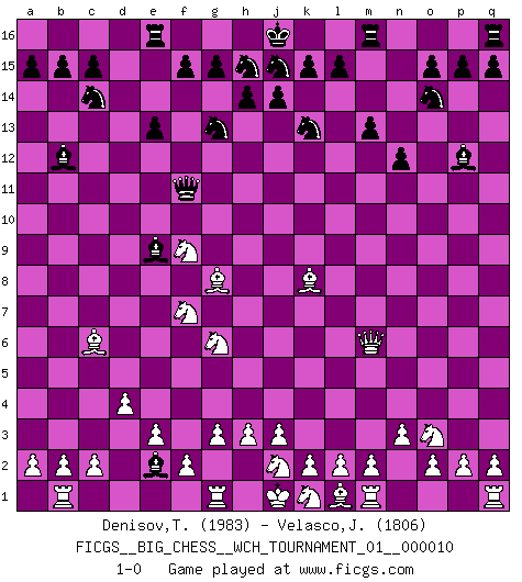 Last move : 1-0 2017 January 26 21:40:23 [Event "FICGS__BIG_CHESS__WCH_TOURNAMENT_01__000010"] [Site "FICGS"] [Date "2016.11.07"] [Round "1"] [White "Denisov,Timofey"] [Black "Velasco,Jose Maria"] [Result "1-0"] [WhiteElo "1983"] [BlackElo "1806"] 1.d2-d4 j15-k13 2.g2-g3 h16-o10 3.n2-n3 d15-d13 4.p1-o3 e15-e13 5.o1-g8 f16-b12 6.h1-d5 p16-o14 7.d5-d13 h15-g13 8.c1-k8 b16-c14 9.d13-j8 g16-j15 10.j2-h4 m15-m13 11.f1-g2 l16-p12 12.g2-a8 k16-h15 13.g1-j2 o10-a10 14.a8-g2 c16-l8 15.e2-e3 n15-n13 16.b1-c3 o16-f8 17.h4-g6 f8-g7 18.h2-j4 a10-f10 19.e1-f1 f10-b6 20.a1-b1 l8-k7 21.j8-m11 n13-n12 22.m11-m6 a16-d16 23.c3-d5 b6-a6 24.d5-e7 a6-f11 25.e7-f9 g7-e9 26.j4-h6 k7-e2 27.f1-g1 d16-d6 28.h6-f7 d6-c6 29.g2-c6 1-0 Follow this game move after move (download)I'd rather have a Pawn than a finger. (Reuben Fine) Meine Liebe ist Schach, Schach, Schach. Ich muss jeden Tag Schach spielen, deshalb fühle ich mich so stark. (Miguel Najdorf) Sin errores no puede haber brillantez. (Emanuel Lasker) La guerre est enfant de la passion, la passion est enfant du narcissisme et le narcissisme est l'enfant. (...) Une autre partie ? (Thibault de Vassal) True nature is revealed in times of difficulty. (Chinese proverb)