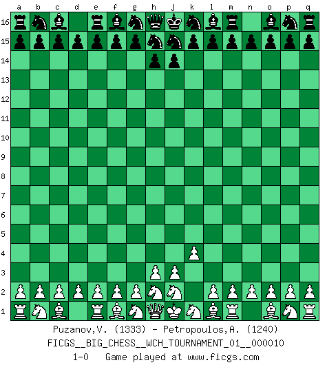 Last move : 1-0 2016 November 10 1:17:35 [Event "FICGS__BIG_CHESS__WCH_TOURNAMENT_01__000010"] [Site "FICGS"] [Date "2016.11.07"] [Round "1"] [White "Puzanov,Vasyl"] [Black "Petropoulos,Athanasios"] [Result "1-0"] [WhiteElo "1333"] [BlackElo "1240"] 1.k2-k4 1-0 Follow this game move after move (download)It was clear to me that the vulnerable point of the American Grandmaster (Bobby Fischer) was in double-edged, hanging, irrational positions, where he often failed to find a win even in a won position. (Efim Geller) Modernes Schach sorgt sich zuviel um Dinge wie Bauernstruktur usw. Vergessen Sie das, Schachmatt beendet das Spiel! (Nigel Short) Los errores estan ahí, esperando a que se cometan. (Savielly Tartakower) Ce qui est bien, c'est d'avoir tout un tas de pièces en prise : l'adversaire ne peut en prendre qu'une à la fois. Cité par Thierry Audin. The real danger is not that computers will begin to think like men, but that men will begin to think like computers. (Sydney J. Harris)