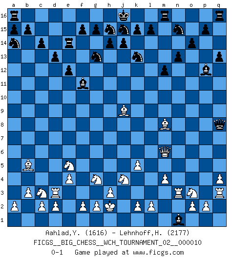 Last move : 0-1 2017 February 27 18:26:53 [Event "FICGS__BIG_CHESS__WCH_TOURNAMENT_02__000010"] [Site "FICGS"] [Date "2016.11.07"] [Round "1"] [White "Aahlad,Yeturu"] [Black "Lehnhoff,Heinz-Georg"] [Result "0-1"] [WhiteElo "1616"] [BlackElo "2177"] 1.e2-e4 j15-k13 2.m2-m4 m15-m13 3.j2-k4 h16-o10 4.h2-g4 e15-e13 5.h1-m5 n15-n13 6.b2-b3 c15-c14 7.c1-b2 o15-o14 8.f1-b5 g16-j15 9.l1-p5 d15-d13 10.k1-l3 h15-g13 11.n2-n4 k16-h15 12.p1-o3 l16-p12 13.o1-j6 q15-q13 14.b2-k10 c16-g12 15.b1-c3 e13-e12 16.g1-f3 g12-f11 17.m5-m6 b16-a14 18.e1-e3 e16-e14 19.f3-e5 f16-d14 20.k10-j9 d14-b12 21.m1-m3 o16-f8 22.q2-q4 p16-n15 23.q1-q3 m13-m12 24.p5-m8 o10-q8 25.e3-d3 f8-k4 26.j3-k4 p12-j6 27.k4-k5 j6-h5 28.l3-j4 f11-n4 29.m3-n3 n4-f11 30.j1-h2 h5-p12 31.a1-n1 b12-n1 0-1 Follow this game move after move (download)A great player and a great example for many. His book My 60 Memorable Games had a big impact on me. It is a shame he didn't continue to enrich the world of chess with his unparalleled understanding after 1972. (Jan Timman, about Bobby Fischer's death) Schach ist ein Teil der Kultur, und wenn es mit der Kultur abwärts geht, geht es auch mit dem Schach abwärts. (Mikhail Moiseyevich Botvinik) Dejen al perfeccionista jugar por correo. (Yasser Seirawan) On entre au jeu d'Echecs comme on entre en Religion. Pour le joueur d'Echecs, la partie d'Echecs c'est l'office, la messe, le défilé du 1er Mai, le dépôt de gerbe au Monument aux Morts. C'est un drame sacré. (Michel Roos) All politicians must be presumed guilty until they are proven innocent. (Dinesh De Silva)