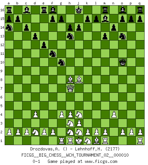 Last move : 0-1 2017 January 16 5:23:59 [Event "FICGS__BIG_CHESS__WCH_TOURNAMENT_02__000010"] [Site "FICGS"] [Date "2016.11.07"] [Round "1"] [White "Drozdovas,Arturas"] [Black "Lehnhoff,Heinz-Georg"] [Result "0-1"] [WhiteElo ""] [BlackElo "2177"] 1.d2-d4 j15-k13 2.g2-g4 h16-o10 3.h1-f3 h15-g13 4.f3-f7 e15-e13 5.c1-j7 m15-m13 6.n2-n4 k16-h15 7.o1-g8 n15-n14 8.h3-h4 d15-d13 9.f1-l6 c15-c14 10.l6-j8 b16-a14 11.b1-d2 e13-e12 12.f7-h7 p16-q14 13.p1-n2 g13-f11 14.j8-h9 h15-g13 15.n2-l3 g16-j15 16.j7-h8 q14-o13 17.l3-j4 l16-m15 18.g1-h3 k13-j11 19.h9-j8 f11-h10 20.e1-h1 h10-g8 21.h7-g8 j15-h13 22.g8-h7 g13-f11 23.a1-g1 j11-g10 0-1 Follow this game move after move (download)When the Chess game is over, the Pawn and the King go back to the same box. (Irish saying) Garry Kasparov war erst in der Großmeister-Organisation GMA, dann in der Profischach-Vereinigung PCA, zum Schluss kehrte er wieder in den Schoß der FIDE zurück. Aber gut, manche Leute sind flexibel (Viswanathan Anand) Por la belleza de sus partidas, la claridad de su juego y lo brillante de sus ideas, Fischer se creó el mismo como un artista de la misma estatura como Brahms, Rembrandt y Shakespeare. (David Levy) Soyez une menace à chaque fois que vous vous asseyez pour jouer. (Ken Smith) The greatest con, that he ever pulled... was making you believe... that he is you. (Revolver, movie)
