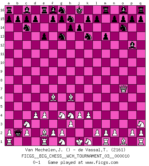 Last move : 0-1 2016 November 21 22:9:24 [Event "FICGS__BIG_CHESS__WCH_TOURNAMENT_03__000010"] [Site "FICGS"] [Date "2016.11.07"] [Round "1"] [White "Van Mechelen,Jan"] [Black "de Vassal,Thibault"] [Result "0-1"] [WhiteElo ""] [BlackElo "2161"] 1.j3-j4 j15-k13 2.k2-k4 h16-o10 3.h2-g4 o10-o2 4.p1-q3 o2-c13 5.b1-c3 m15-m13 6.e2-e4 h15-g13 7.l1-f6 p16-o14 8.d2-d4 e15-e13 9.j2-h4 l16-p12 10.f1-e2 b16-c14 11.h1-o7 k16-h15 12.c1-j7 c13-b12 13.j7-h6 b12-b2 0-1 Follow this game move after move (download)Some sacrifices are sound; the rest are mine. (Mikhail Tal) Strategie ist, wie man ein Mädchen auf den Rücksitz bekommt. Taktik ist, was man tut, wenn man dann dort ist. (Anonymous) Cuando la partida de Ajedrez termina, el Peón y el Rey regresan a la misma caja. (Irish saying) Il a essayé de se convaincre qu'il pourrait empêcher toutes les erreurs et ne jamais perdre. L'horreur ! Gary Kasparov au sujet de Robert Fischer. A woman without a man is like a fish without a bicycle. (Gloria Steinem)