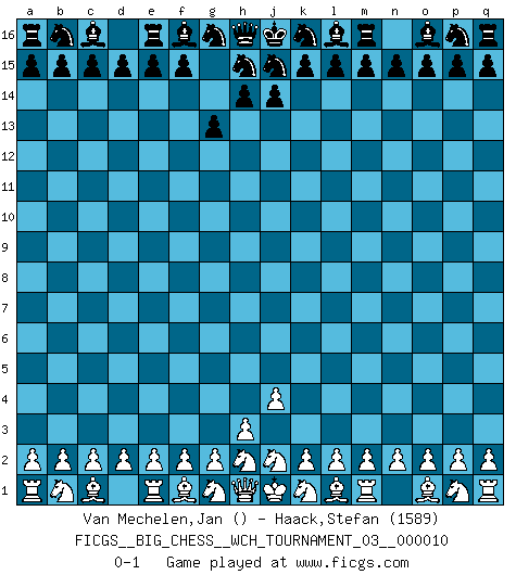 Last move : 0-1 2016 December 1 16:3:17 [Event "FICGS__BIG_CHESS__WCH_TOURNAMENT_03__000010"] [Site "FICGS"] [Date "2016.11.07"] [Round "1"] [White "Van Mechelen,Jan"] [Black "Haack,Stefan"] [Result "0-1"] [WhiteElo ""] [BlackElo "1589"] 1.j3-j4 g15-g13 0-1 Follow this game move after move (download)Pawn endings are to Chess what putting is to golf. (Cecil Purdy) Das Spiel gibt uns die Genugtuung, die das Leben uns versagt. (Emanuel Lasker) El Ajedrez es un terrible juego. Si no controlas el centro, tu oponente tiene una posición mas holgada. Si tienes control del centro, ¡entonces realmente tu tienes algo de que preocuparte!. (Siegbert Tarrasch) L'ordinateur a tué l'originalité. Il n'y a plus guère d'aventures sur l'échiquier. (Jacob Murray) Life is the sum of all your choices. (Albert Camus)