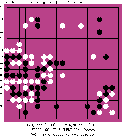 Last move : 0-1 2007 May 1 22:54:48 [Event "FICGS__GO__TOURNAMENT_DAN__000006"] [Site "FICGS"] [Date "2007.03.31"] [Round "1"] [Black "Dew,John"] [White "Ruzin,Mikhail"] [Result "0-1"] [Rating 1 "1100"] [Rating 2 "1957"] 1.q4 d4 2.q17 d16 3.r11 n16 4.q15 k16 5.f3 d6 6.d2 c3 7.j3 r3 8.q3 r4 9.r5 s5 10.s6 q5 11.r6 q2 12.p2 s2 13.o3 p11 14.c11 c13 15.c8 c7 16.d8 d11 17.d10 e11 18.f17 e17 19.f16 e10 20.d9 c12 21.c5 b7 22.e6 e5 23.d5 c4 24.f5 e4 25.f4 e7 26.f6 d7 27.f8 f7 28.g7 g8 29.f9 h7 30.g6 h8 31.b8 c10 32.b5 b4 33.b6 a6 34.a8 a7 35.b11 b10 36.a10 b12 37.a11 a12 38.a9 h11 39.h10 g10 40.g9 h9 41.j10 k8 42.k10 g11 0-1 Here are the names of the openings (joseki) played in the four corners : Corner d4 : d4 f3 Hoshi (Hwajeom, Seongjeom, Xingwei`) 4-4 Point. The star or hoshi (4-4) point, emphasizing influence at the potential expense of territory. Ikken Kakari (Hankan Keolch'im, Yi Gua`jiao~, 1-Space Low Approach). Black 2 is the standard approach move to the 4-4. Corner q4 : q4 r3 Hoshi (Hwajeom, Seongjeom, Xingwei`) 4-4 Point. The star or hoshi (4-4) point, emphasizing influence at the potential expense of territory. Corner d16 : d16 c11 Hoshi (Hwajeom, Seongjeom, Xingwei`) 4-4 Point. The star or hoshi (4-4) point, emphasizing influence at the potential expense of territory. Player White won this Go (weiqi, baduk) game. Follow this game move after move (download)Keep away from thickness. (Anonymous) Nobody is always a winner, and anybody who says he is, is either a liar or doesn't play poker. (Amarillo Slim)