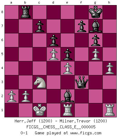 Last move : 0-1 2006 August 2 23:28:56 [Event "FICGS__CHESS__CLASS_E__000005"] [Site "FICGS"] [Date "2006.05.31"] [Round "1"] [White "Herr,Jeff"] [Black "Milner,Trevor"] [Result "0-1"] [WhiteElo "1200"] [BlackElo "1200"] 1.d4 Nf6 2.c4 g6 3.Nc3 Bg7 4.e4 d6 5.f3 O-O 6.Be3 Nc6 7.Qd2 Re8 8.Bd3 e5 9.d5 Nb4 10.Nge2 Nxd3+ 11.Qxd3 a6 12.h4 h5 13.Bg5 Qd7 14.O-O-O b5 15.cxb5 axb5 16.Qxb5 Qe7 17.g4 hxg4 18.fxg4 Ba6 19.Qb4 Reb8 20.Bxf6 Qxf6 21.g5 Qf3 22.Qxb8+ Rxb8 23.Rde1 Bxe2 0-1 King's Indian : Saemisch, 6...Nc6 Kingside Castling by player Black (move 5) Queenside Castling by player White (move 14) Player Black won this chess game. Follow this game move after move (download)A thorough understanding of the typical mating continuations makes the most complicated sacrificial combinations leading up to them not only not difficult, but almost a matter of course. (Siegbert Tarrasch) Alle Schachspieler sollten auch ein Hobby haben. (Savielly Grigorievitsch Tartakower) El Ajedrez no es una pizca de inferior al violín, y tenemos un gran número de violinistas profesionales. (Mikhail Botvinnik) Ce qui caractérise les parties de combat, c'est que si le défenseur a constamment de difficiles problèmes à résoudre, l'attaquant doit chercher sans relâche de nouvelles possibilités d'attaque. (Koblentz) When a man with money meets a man with experience, the man with experience leaves with money and the man with money leaves with experience. (Anonymous)
