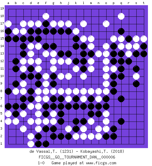 Last move : 1-0 2007 November 5 14:26:57 [Event "FICGS__GO__TOURNAMENT_DAN__000006"] [Site "FICGS"] [Date "2007.03.31"] [Round "1"] [Black "de Vassal,Thibault"] [White "Kobayashi,Tetsuya"] [Result "1-0"] [Rating 1 "1231"] [Rating 2 "2018"] 1.q16 d4 2.q4 d17 3.c15 c12 4.e16 e17 5.f16 g17 6.c10 e12 7.g16 h17 8.h16 j17 9.j16 k16 10.k15 l15 11.k14 l17 12.e10 g12 13.g10 c16 14.b15 e14 15.d16 c17 16.e15 d14 17.d15 j12 18.l14 m15 19.l12 h10 20.h11 g11 21.j11 f10 22.g9 f9 23.e9 f8 24.c6 j10 25.c4 c3 26.q10 k11 27.k4 r14 28.r15 q14 29.g3 o3 30.p3 o4 31.q7 k2 32.d5 b4 33.b5 c5 34.b6 e5 35.m3 d6 36.d7 e7 37.d8 l3 38.l4 m2 39.k3 l2 40.m5 o17 41.o2 n2 42.p2 n3 43.j2 m4 44.n5 o5 45.o6 j3 46.h2 b8 47.b9 c8 48.c7 c9 49.b11 q18 50.h5 s10 51.s9 n13 52.r12 j7 53.k6 l8 54.s13 s14 55.t14 t15 56.t13 s15 57.b12 m11 58.c13 o8 59.p8 o9 60.p12 f2 61.p14 p15 62.q13 o14 63.p13 q15 64.f3 e3 65.k7 k8 66.h7 h8 67.g7 g8 68.j6 j8 69.f14 f13 70.g14 b16 71.f17 f18 72.m7 m8 73.p9 n7 74.n6 d13 75.c14 l7 76.l6 g5 77.g6 g4 78.h4 f4 79.g2 o10 80.e2 d2 81.e1 d1 82.f1 p11 83.q11 o12 84.o7 m6 85.l11 l10 86.h13 h12 87.f6 e6 88.f5 e4 89.j13 m12 90.k12 e11 91.d11 d12 92.m7 n8 93.m13 m14 94.l13 a5 95.a6 a4 96.p10 o11 97.a16 a17 98.a15 c11 99.d10 f7 100.h6 r13 101.s11 o13 102.q12 e8 103.a8 g13 104.m6 pass 105.pass pass 106.pass 1-0 Comment by player 1 : Thibault de Vassal : Thanks for the game. Greetings from France ! Here are the names of the openings (joseki) played in the four corners : Corner d16 : d17 c15 Komoku (Somok, Xiao~mu`) 3-4 Point. The komoku (3-4) point is the traditional corner enclosure move.. Ikken Kakari (Hankan Keolch'im, Yi Gua`jiao~, 1-Space Low Pincer). The small knight move is the basic approach move to the 3-4 point stone. It has been continually used for over four centuries. There are limitless variations, with new moves constantly being discovered. Black 2 opens the door to a treaure store of joseki. Corner q16 : q16 l15 Hoshi (Hwajeom, Seongjeom, Xingwei`) 4-4 Point. The star or hoshi (4-4) point, emphasizing influence at the potential expense of territory. Corner d4 : d4 g9 Hoshi (Hwajeom, Seongjeom, Xingwei`) 4-4 Point. The star or hoshi (4-4) point, emphasizing influence at the potential expense of territory. Corner q4 : q4 o3 Hoshi (Hwajeom, Seongjeom, Xingwei`) 4-4 Point. The star or hoshi (4-4) point, emphasizing influence at the potential expense of territory. Ikken Kakari (Hankan Keolch'im, Yi Gua`jiao~, 1-Space Low Approach). White 2 is the standard approach move to the 4-4. Player Black won this Go (weiqi, baduk) game. Follow this game move after move (download)With less than 15 stones in danger, tenuki. (Anonymous) All battles are fought by scared men who'd rather be someplace else. (John Wayne in the movie In harm's way)