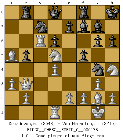 Last move : 1-0 2016 November 24 18:45:46 [Event "FICGS__CHESS__RAPID_A__000195"] [Site "FICGS"] [Date "2016.11.07"] [Round "1"] [White "Drozdovas,Arturas"] [Black "Van Mechelen,Jan"] [Result "1-0"] [WhiteElo "2043"] [BlackElo "2210"] 1.d4 f5 2.g3 Nf6 3.Nf3 g6 4.Bg2 Bg7 5.c4 O-O 6.Nc3 d6 7.O-O c6 8.Rb1 a5 9.Qb3 Kh8 10.Be3 Na6 11.Rfd1 Ng4 12.Bg5 h6 13.Bd2 Rb8 14.Rbc1 Bd7 15.a3 b5 16.cxb5 cxb5 17.Nd5 Be6 18.Nh4 Bf7 19.Rc6 Nc7 20.Bxa5 1-0 Dutch defense Kingside Castling by player Black (move 5) Kingside Castling by player White (move 7) Player White won this chess game. Follow this game move after move (download)All Chess players should have a hobby. (Savielly Tartakower) Wie bekannt hörte Morphy 1859 auf, Schach zu spielen. Seine Enttäuschung galt nicht so sehr dem Schach, wie den Schachspielern. (Robert James Fischer) El Ajedrez no es como la vida... ¡tiene reglas!. (Mark Pasternak) La conception d'un plan est le processus par lequel un joueur exploite les avantages de sa position tout en s'efforçant d'en réduire au minimum les inconvénients. Afin de garantir le succès, un plan doit toujours se fonder sur un diagnostic objectif des particularités d'une position. La conception d'un plan est d'autant plus difficile que la position est équilibrée, et grandement facilitée lorsqu'il n'existe qu'un seul plan susceptible de répondre aux exigences de la position. (Harry Golombek) Establishing goals is all right if you don't let them deprive you of interesting detours. (Doug Larson)