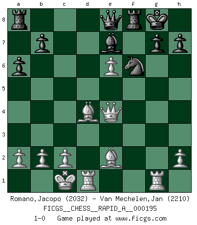 Last move : 1-0 2016 November 30 16:49:5 [Event "FICGS__CHESS__RAPID_A__000195"] [Site "FICGS"] [Date "2016.11.07"] [Round "1"] [White "Romano,Jacopo"] [Black "Van Mechelen,Jan"] [Result "1-0"] [WhiteElo "2032"] [BlackElo "2210"] 1.e4 c5 2.Nf3 e6 3.d4 cxd4 4.Nxd4 Nf6 5.Nc3 d6 6.Be3 Nc6 7.Qd2 Be7 8.f3 O-O 9.O-O-O d5 10.Be2 a6 11.g4 Nxd4 12.Qxd4 dxe4 13.Qe5 Qe8 14.Bd4 Bd7 15.g5 Nh5 16.f4 f6 17.gxf6 Nxf6 18.Rhg1 Rf7 19.Nxe4 Bc6 20.f5 Bxe4 21.fxe6 Rf8 22.Qxe4 1-0 Sicilian : Anderssen variation Kingside Castling by player Black (move 8) Queenside Castling by player White (move 9) Player White won this chess game. Follow this game move after move (download)Don't even mention losing to me. I can't stand to think of it. (Bobby Fischer) Ich habe kein Problem mit Frauen, sondern nur mit dem Niveau ihres Schachspiels (Judith Polgar) El juego de Fischer siempre fue nítido, racional y brillante. Uno de los mejores por siempre. (Dave Regis) Ce qui caractérise les parties de combat, c'est que si le défenseur a constamment de difficiles problèmes à résoudre, l'attaquant doit chercher sans relâche de nouvelles possibilités d'attaque. (Koblentz) Big Chess is a place for big hallucinations. (Thibault de Vassal)