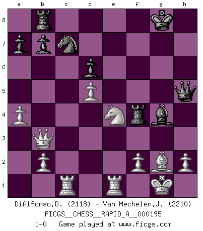 Last move : 1-0 2016 November 29 19:9:3 [Event "FICGS__CHESS__RAPID_A__000195"] [Site "FICGS"] [Date "2016.11.07"] [Round "1"] [White "DiAlfonso,Darren"] [Black "Van Mechelen,Jan"] [Result "1-0"] [WhiteElo "2118"] [BlackElo "2210"] 1.d4 f5 2.g3 Nf6 3.Bg2 g6 4.Nf3 Bg7 5.O-O O-O 6.c4 d6 7.Nc3 c6 8.d5 e5 9.e4 cxd5 10.cxd5 Na6 11.Ng5 Nc7 12.exf5 gxf5 13.Qb3 Qe7 14.Rd1 Rb8 15.a4 h6 16.Nf3 f4 17.gxf4 Nh5 18.fxe5 Bxe5 19.Nxe5 Qxe5 20.Bxh6 Nf4 21.Re1 Qh5 22.Bxf4 Rxf4 23.Ne4 Bg4 24.Rac1 1-0 Dutch defense Kingside Castling by player White (move 5) Kingside Castling by player Black (move 5) Player White won this chess game. Follow this game move after move (download)Chess is the gymnasium of the mind. (Blaise Pascal) Ich habe Kasparov in Rente geschickt. (Veselin Topalov) Uno no tiene que jugar muy bien, es suficiente jugar mejor que el oponente. (Siegbert Tarrasch) Un footballeur joue avec ses pieds, parfois avec sa tête. Un joueur d'échecs ne joue qu'avec sa tête. Et quand il ne joue plus, il meurt. (Jacob Murray) Over-the-board chess is the favorite of mortals, correspondence chess is the favorite of the gods. (Eduard Dyckhoff)