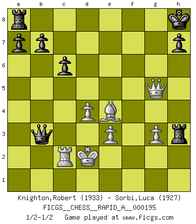 Last move : 1/2-1/2 2017 March 2 22:15:14 [Event "FICGS__CHESS__RAPID_A__000195"] [Site "FICGS"] [Date "2016.11.07"] [Round "1"] [White "Knighton,Robert"] [Black "Sorbi,Luca"] [Result "1/2-1/2"] [WhiteElo "1933"] [BlackElo "1927"] 1.g4 d5 2.Bg2 c6 3.h3 e5 4.d4 e4 5.c4 Bd6 6.Nc3 Ne7 7.Bg5 O-O 8.e3 f6 9.Bh4 g5 10.Bg3 Bxg3 11.fxg3 f5 12.Qb3 Kh8 13.O-O-O dxc4 14.Qxc4 Nd5 15.Qe2 Na6 16.h4 Nab4 17.hxg5 Qxg5 18.Nxd5 Nxd5 19.Re1 Nb4 20.Rf1 Be6 21.Nh3 Qg8 22.gxf5 Bc4 23.Qh5 Nd3+ 24.Kd2 Qd5 25.Rc1 Rxf5 26.Qh6 Qa5+ 27.Rc3 Rb5 28.Rb1 Rh5 29.Qd6 Qxa2 30.Bxe4 Qxb1 31.Qf6+ Kg8 32.Rxc4 Qxb2+ 33.Rc2 Qb4+ 34.Kxd3 Qb3+ 35.Kd2 Rxh3 36.Qg5+ Kh8 1/2-1/2 Grob's attack Kingside Castling by player Black (move 7) Queenside Castling by player White (move 13) This chess game ended in a draw. Follow this game move after move (download)When I have White, I win because I am white; When I have Black, I win because I am Bogolyubov. (Bogolyubov) Gewinnen beim Schach fördert das Selbstvertrauen. Beim Sex spüre ich sowas nicht... (Garry Kasparov) Muchos se han convertido en Maestros de Ajedrez, nadie se ha convertido en el Maestro del Ajedrez. (Siegbert Tarrasch) Je fais ceci parce que dans cinquante coups j'obtiendrai cela; je m'appelle Mikhail Moisevitch Botvinnik. (Botvinnik) Happy endings are just stories that haven't finished yet. (Jane Smith in Mr & Mrs Smith)