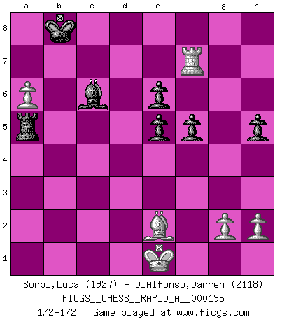 Last move : 1/2-1/2 2017 January 14 13:5:16 [Event "FICGS__CHESS__RAPID_A__000195"] [Site "FICGS"] [Date "2016.11.07"] [Round "1"] [White "Sorbi,Luca"] [Black "DiAlfonso,Darren"] [Result "1/2-1/2"] [WhiteElo "1927"] [BlackElo "2118"] 1.e4 c5 2.Nf3 d6 3.d4 cxd4 4.Nxd4 Nf6 5.Nc3 a6 6.Bg5 e6 7.f4 Qb6 8.Qd2 Qxb2 9.Rb1 Qa3 10.f5 Nc6 11.fxe6 fxe6 12.Nxc6 bxc6 13.e5 dxe5 14.Bxf6 gxf6 15.Ne4 Be7 16.Be2 h5 17.Rb3 Qa4 18.c4 f5 19.Nd6+ Bxd6 20.Qxd6 Qa5+ 21.Kf2 Ra7 22.c5 Qc7 23.Rd1 Qxd6 24.Rxd6 Ke7 25.Rb8 Rb7 26.Ra8 Rb2 27.Rxc6 Bd7 28.Ra7 Ra8 29.Rcxa6 Rxa7 30.Rxa7 Rc2 31.a4 Kd8 32.Ra8+ Kc7 33.Ra7+ Kc8 34.Ke1 Bc6 35.a5 Rxc5 36.a6 Ra5 37.Rf7 Kb8 1/2-1/2 Sicilian : Najdorf, 7...Qb6 This chess game ended in a draw. Follow this game move after move (download)I thought the most common mistake [in chess] was the first one: Learning the game :P (Garvin Gray, FICGS forum) Nach Morphy wurde nichts neues mehr in der Behandlung offener Positionen gefunden. (Mikhail Moiseyevich Botvinik) El Ajedrez es un expediente tonto que hace creer a la gente inactiva que hacen una cosa muy astuta cuando solamente estan perdiendo su tiempo. (George Bernard Shaw) Nous sommes les pions de la mystérieuse partie d'Echecs jouée par Dieu. Il nous déplace, nous arrête, nous pousse encore, puis nous lance un à un dans la boîte du Néant. Epitaphe sur la tombe de David Janowsky (1868-1927). Methinks King Thibault should dub Marius Zubac a knight of the square board... I mean table, henceforth addressing him as Sir Marius, and bestow on him a suitable land from the kingdom of FICGS & marry him off to a worthy, fair maiden, lest he slice our heads with his mighty sword in his wrath. (Dinesh De Silva)