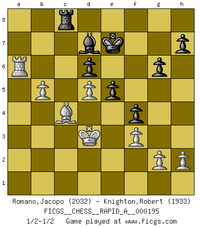 Last move : 1/2-1/2 2017 March 28 13:43:32 [Event "FICGS__CHESS__RAPID_A__000195"] [Site "FICGS"] [Date "2016.11.07"] [Round "1"] [White "Romano,Jacopo"] [Black "Knighton,Robert"] [Result "1/2-1/2"] [WhiteElo "2032"] [BlackElo "1933"] 1.e4 c5 2.Nf3 d6 3.d4 cxd4 4.Nxd4 Nf6 5.Nc3 g6 6.Be3 Bg7 7.f3 O-O 8.Qd2 Nc6 9.Bc4 Bd7 10.O-O-O Rc8 11.Bb3 Nxd4 12.Bxd4 b5 13.Nd5 Nxd5 14.Bxg7 Kxg7 15.exd5 a5 16.a3 f6 17.Rde1 Rf7 18.Re2 Rb8 19.Rhe1 b4 20.axb4 Rxb4 21.Re4 Rxe4 22.Rxe4 Qb6 23.Qd4 Qb7 24.Qd2 Qa7 25.Qe3 Qxe3+ 26.Rxe3 f5 27.Bc4 Kf6 28.Ra3 a4 29.b3 axb3 30.cxb3 f4 31.b4 Rf8 32.Kc2 Rc8 33.Kd3 e5 34.Ra6 Ke7 35.b5 1/2-1/2 Sicilian : Dragon, Yugoslav attack, 7...O-O Kingside Castling by player Black (move 7) Queenside Castling by player White (move 10) This chess game ended in a draw. Follow this game move after move (download)By this measure (on the gap between Fischer & his contemporaries), I consider him the greatest world champion. (Garry Kasparov) Stelle das Brett so, daß die Sonne in die Augen deines Gegners scheint. (Ruy López) Yo siempre he tenido un ligero sentimiento de lástima por una persona que no tiene conocimiento del Ajedrez. (Siegbert Tarrasch) On a dit que l'homme se distingue de l'animal par le fait qu'il achète plus de livres qu'il ne peut en lire. Je voudrais suggérer qu'inclure à la liste des livres quelques livres d'échecs rendrait la distinction manifeste. (Edward Lasker) Success without honor is an unseasoned dish; it will satisfy your hunger, but it won't taste good. (Joe Paterno)