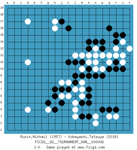 Last move : 1-0 2007 May 18 11:57:56 [Event "FICGS__GO__TOURNAMENT_DAN__000006"] [Site "FICGS"] [Date "2007.03.31"] [Round "1"] [Black "Ruzin,Mikhail"] [White "Kobayashi,Tetsuya"] [Result "1-0"] [Rating 1 "1957"] [Rating 2 "2018"] 1.q16 d4 2.q4 d17 3.q10 o3 4.m3 r3 5.r4 q3 6.p4 o2 7.n5 r12 8.r11 q12 9.r14 p10 10.p9 o10 11.o9 o12 12.n10 q11 13.r10 n11 14.m11 m10 15.n9 m12 16.l11 l7 17.l8 k8 18.l9 l5 19.m5 m6 20.n6 m8 21.n7 m7 22.m9 k6 23.p11 o11 24.p13 p12 25.n13 o13 26.n14 n12 27.o14 l12 28.k11 s14 29.r15 r13 30.p14 s11 31.s10 s12 32.s15 t13 33.k16 h17 34.j17 h16 35.j7 j8 36.h7 h5 37.k7 d11 38.g5 g4 39.j5 j6 40.h6 l4 41.h4 l3 42.n3 1-0 Here are the names of the openings (joseki) played in the four corners : Corner q4 : q4 o3 Hoshi (Hwajeom, Seongjeom, Xingwei`) 4-4 Point. The star or hoshi (4-4) point, emphasizing influence at the potential expense of territory. Ikken Kakari (Hankan Keolch'im, Yi Gua`jiao~, 1-Space Low Approach). White 2 is the standard approach move to the 4-4. Corner q16 : q16 r12 Hoshi (Hwajeom, Seongjeom, Xingwei`) 4-4 Point. The star or hoshi (4-4) point, emphasizing influence at the potential expense of territory. Corner d4 : d4 j7 Hoshi (Hwajeom, Seongjeom, Xingwei`) 4-4 Point. The star or hoshi (4-4) point, emphasizing influence at the potential expense of territory. Player Black won this Go (weiqi, baduk) game. Follow this game move after move (download)When your opponent has two weak groups, attack them both at once. (Anonymous) All men can see these tactics whereby I conquer, but what none can see is the strategy out of which victory is evolved. (Sun Tzu)