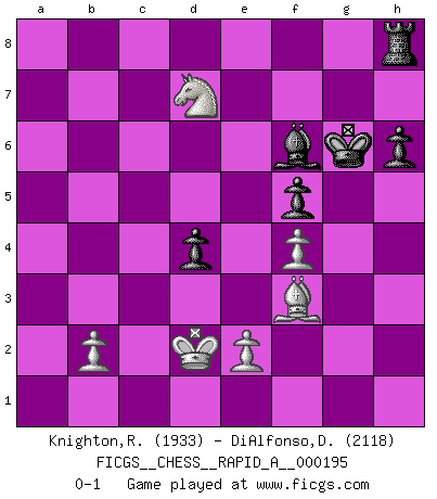 Last move : 0-1 2017 January 31 16:11:50 [Event "FICGS__CHESS__RAPID_A__000195"] [Site "FICGS"] [Date "2016.11.07"] [Round "1"] [White "Knighton,Robert"] [Black "DiAlfonso,Darren"] [Result "0-1"] [WhiteElo "1933"] [BlackElo "2118"] 1.g4 d5 2.Bg2 Bxg4 3.c4 c6 4.Qb3 e6 5.Qxb7 Nd7 6.Nc3 Ne7 7.cxd5 exd5 8.d4 Rb8 9.Qa6 Rb6 10.Qd3 Ng6 11.h3 Be6 12.Nf3 Bd6 13.h4 O-O 14.Ng5 Nf6 15.h5 Nf4 16.Bxf4 Bxf4 17.Nxe6 fxe6 18.Nd1 Bd6 19.a3 Kh8 20.Rc1 h6 21.Rh3 Nd7 22.Kf1 c5 23.dxc5 Nxc5 24.Qg6 Nb3 25.Rxb3 Rxb3 26.Qxe6 Rb5 27.Rc6 Bxa3 28.Qe5 Rf6 29.Rxf6 gxf6 30.Qe3 Bf8 31.Qxa7 d4 32.Qf7 Rg5 33.f4 Rg7 34.Qe6 Be7 35.Nf2 Qa5 36.Nd3 Qxh5 37.Bd5 Qg6 38.Ke1 f5 39.Qe5 Bf6 40.Qb8+ Kh7 41.Kd2 Qg1 42.Bf3 Qe3+ 43.Kc2 Qe6 44.Kd2 Kg6 45.Nc5 Rg8 46.Qc7 Qc8 47.Qxc8 Rxc8 48.Nd7 Rh8 0-1 Grob : Fritz gambit Kingside Castling by player Black (move 13) Player Black won this chess game. Follow this game move after move (download)The way he plays Chess demonstrates a man's whole nature. (Stanley Ellin) Im Schach gewinnt jeder. Hat man Freunde am Spiel - und das ist die Hauptsache - ist auch der Verlust einer Partie kein Unglück. (David Bronstein) ¿Esta Bobby Fischer algo cuerdo?. (Salo Flohr) Le succès, c'est être capable d'aller d'échec en échec sans perdre son enthousiasme. (Winston Churchill) Tomorrow's what you make of it. (Horatio Caine, C.S.I. Miami)