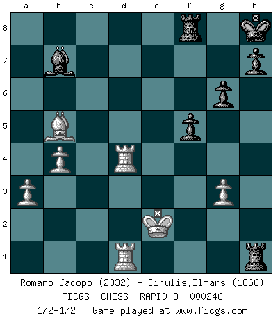 Last move : 1/2-1/2 2017 February 18 18:18:48 [Event "FICGS__CHESS__RAPID_B__000246"] [Site "FICGS"] [Date "2016.11.08"] [Round "1"] [White "Romano,Jacopo"] [Black "Cirulis,Ilmars"] [Result "1/2-1/2"] [WhiteElo "2032"] [BlackElo "1866"] 1.e4 e6 2.d4 d5 3.Nd2 Be7 4.Bd3 c5 5.dxc5 Nf6 6.Qe2 O-O 7.Ngf3 a5 8.O-O Na6 9.e5 Nd7 10.c3 Naxc5 11.Bc2 b5 12.a3 Ba6 13.b4 Na4 14.Nb3 Nxc3 15.Qd3 Ne4 16.Nxa5 Rc8 17.Bb2 f5 18.Qe2 Nb6 19.Rfd1 Qc7 20.Nd4 Qxe5 21.Nac6 Qd6 22.Nxe7+ Qxe7 23.f3 Nc4 24.Bb3 e5 25.fxe4 exd4 26.e5 Nxb2 27.Bxd5+ Kh8 28.Qxb2 Qxe5 29.Qxd4 Qxd4+ 30.Rxd4 Rc7 31.g3 g6 32.Bg2 Bb7 33.Bf1 Rc2 34.Bxb5 Rg2+ 35.Kf1 Rxh2 36.Rad1 Rh1+ 37.Ke2 1/2-1/2 French : Tarrasch Kingside Castling by player Black (move 6) Kingside Castling by player White (move 8) This chess game ended in a draw. Follow this game move after move (download)I had a toothache during the first game. In the second game I had a headache. In the third game it was an attack of rheumatism. In the fourth game, I wasn't feeling well. And in the fifth game? Well, must one have to win every game ? (Siegbert Tarrasch) Über Karpov: Er war und ist ein Vertreter der russischen Reaktionäre. Das steckt tief in seiner Seele, wehalb ich nicht nett mit ihm umgehen kann. (Viktor Kortschnoi) Siempre es mucho mejor sacrificar las piezas de tu oponente. (Savielly Tartakover) Des combinaisons [dans le jeu d'échecs] pareilles à des mélodies. Je crois entendre pour ainsi dire la musique des coups... (Vladimir Nabokov) The next best thing to gambling and winning is gambling and loosing. (Nick Dandalos)
