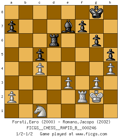 Last move : 1/2-1/2 2017 February 24 16:48:24 [Event "FICGS__CHESS__RAPID_B__000246"] [Site "FICGS"] [Date "2016.11.08"] [Round "1"] [White "Forsti,Eero"] [Black "Romano,Jacopo"] [Result "1/2-1/2"] [WhiteElo "2000"] [BlackElo "2032"] 1.d4 Nf6 2.Nf3 g6 3.Nc3 d5 4.Bf4 Bg7 5.e3 O-O 6.Be2 c5 7.Ne5 Nc6 8.O-O cxd4 9.exd4 Bf5 10.Nxc6 bxc6 11.Na4 Nd7 12.c3 e5 13.Be3 Re8 14.b3 Nf8 15.Qd2 h5 16.dxe5 Bxe5 17.Bd3 Bxd3 18.Qxd3 Ne6 19.g3 Bf6 20.Rae1 Qa5 21.c4 Rad8 22.h4 dxc4 23.Qxc4 Nd4 24.Kg2 Qb5 25.Nc5 Qxc4 26.bxc4 Nc2 27.Re2 Nxe3+ 28.Rxe3 Rxe3 29.fxe3 Be7 30.Nb3 c5 31.Nc1 Rd6 32.Rf2 1/2-1/2 King's Indian : East Indian defense Kingside Castling by player Black (move 5) Kingside Castling by player White (move 8) This chess game ended in a draw. Follow this game move after move (download)Chess is a beautiful mistress. (Bent Larsen) Ein bischen Romantik kann weder im Schach noch in der Liebe schaden. Also versuche ich mich ab und zu daran zu erinnern. (Nigel Short) El Ajedrez era la lengua materna de Capablanca. (Reti) Fischer est le meilleur joueur du monde et Karpov n'est qu'un joueur de bistrot. (Garry Kasparov, agé de 16 ans) You must do what you feel is right... of course. (Obi-Wan Kenobi in Star Wars ep.4)