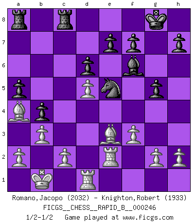 Last move : 1/2-1/2 2017 March 1 2:37:4 [Event "FICGS__CHESS__RAPID_B__000246"] [Site "FICGS"] [Date "2016.11.08"] [Round "1"] [White "Romano,Jacopo"] [Black "Knighton,Robert"] [Result "1/2-1/2"] [WhiteElo "2032"] [BlackElo "1933"] 1.e4 c5 2.Nf3 d6 3.d4 cxd4 4.Nxd4 Nf6 5.Nc3 g6 6.Be3 Bg7 7.f3 O-O 8.Qd2 Nc6 9.Bc4 Nxd4 10.Bxd4 Be6 11.Bb3 Qa5 12.O-O-O b5 13.Kb1 b4 14.Nd5 Bxd5 15.exd5 Qb5 16.Qd3 Qxd3 17.Rxd3 Nd7 18.Re1 Ne5 19.R3d1 g5 20.Ba4 a5 21.Re2 Rfc8 22.Be3 Bf6 23.b3 1/2-1/2 Sicilian : Dragon, Yugoslav attack, 7...O-O Kingside Castling by player Black (move 7) Queenside Castling by player White (move 12) This chess game ended in a draw. Follow this game move after move (download)Chess is a part of culture and if a culture is declining then Chess too will decline. (Mikhail Botvinnik) Es gibt Leute, die glauben, alles wäre vernünftig, was man mit einem ernsthaften Gesicht tut. (Georg Christoph Lichtenberg) Cuando tengas duda... ¡juega al Ajedrez!. (Tevis) J'apprécie les joueurs d'est-indienne, c'est grâce à eux que je nourris ma famille depuis tant d'années. (Petrosian) Before all elsed, be armed. (Niccolo Machiavelli)