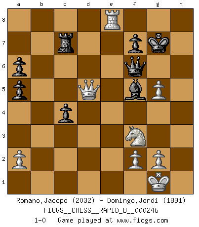 Last move : 1-0 2017 March 14 21:58:6 [Event "FICGS__CHESS__RAPID_B__000246"] [Site "FICGS"] [Date "2016.11.08"] [Round "1"] [White "Romano,Jacopo"] [Black "Domingo,Jordi"] [Result "1-0"] [WhiteElo "2032"] [BlackElo "1891"] 1.e4 c5 2.Nf3 h6 3.Nc3 g5 4.d4 Bg7 5.dxc5 Bxc3+ 6.bxc3 Qa5 7.Qd4 Nf6 8.Qb4 Qc7 9.Bd3 Na6 10.Bxa6 bxa6 11.Rb1 Qc6 12.O-O Qxe4 13.c4 Qxc2 14.Rb2 a5 15.Qb5 Qf5 16.Re2 e6 17.Rd1 O-O 18.Nd4 a6 19.Qb6 Qg6 20.c6 d5 21.Nf3 dxc4 22.Ba3 Nd5 23.Rxd5 exd5 24.Bxf8 Kxf8 25.Qb2 Bf5 26.c7 Rc8 27.Qh8+ Qg8 28.Qxh6+ Qg7 29.Qd6+ Kg8 30.Qxd5 Qf6 31.h4 Rxc7 32.Re8+ Kg7 33.hxg5 1-0 Sicilian defense Kingside Castling by player White (move 12) Kingside Castling by player Black (move 17) Player White won this chess game. Follow this game move after move (download)Chess holds its master in its own bonds, shackling the mind and brain so that the inner freedom of the very strongest must suffer. (Albert Einstein) Die größte Kunst beim Schach besteht darin dem Gegner nicht zu zeigen was er tun kann. (Garry Kasparov) Una clavada es mas poderosa que una espada. (Fred Reinfeld) Vous n'êtes pas toujours obligé de jouer le meilleur coup. Un coup doit être actif, entreprenant, correct et beau ! (David Bronstein) When you stop learning you start dying. (Scott Adams)