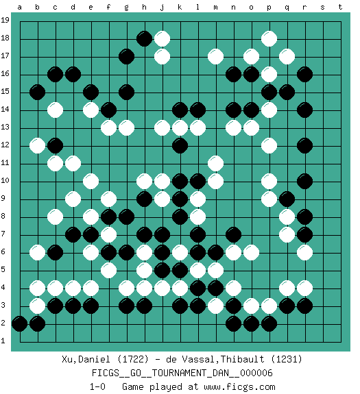 Last move : 1-0 2007 June 20 16:3:29 [Event "FICGS__GO__TOURNAMENT_DAN__000006"] [Site "FICGS"] [Date "2007.03.31"] [Round "1"] [Black "Xu,Daniel"] [White "de Vassal,Thibault"] [Result "1-0"] [Rating 1 "1722"] [Rating 2 "1231"] 1.r16 q4 2.d16 d4 3.c6 c8 4.c3 c4 5.d3 e4 6.e3 b3 7.b2 b4 8.a2 e6 9.g3 p16 10.n16 p14 11.r14 p12 12.r12 p10 13.r10 q8 14.q9 p9 15.r8 q7 16.r7 r6 17.q3 p3 18.r3 r4 19.p2 o3 20.o2 j17 21.g17 m17 22.p17 o17 23.o16 q17 24.p15 p18 25.q15 n6 26.n3 n4 27.m4 m3 28.n2 m5 29.l4 k6 30.o14 o13 31.n14 n13 32.k12 c14 33.c16 d11 34.g15 m11 35.c12 c11 36.b15 b12 37.k10 l9 38.l10 m10 39.k9 l8 40.f8 e8 41.e9 f9 42.g8 e10 43.e7 d9 44.d7 e14 45.f6 f5 46.g6 b6 47.j5 g13 48.h18 j18 49.f14 f13 50.e15 h10 51.l14 l13 52.k14 k4 53.k5 l5 54.l3 h5 55.k3 g4 56.h3 k13 57.j6 h6 58.h7 j4 59.j7 h4 60.h9 j10 61.l6 j9 62.k8 j13 63.l7 f7 64.n7 o6 65.m6 1-0 Comment by player 2 : Thibault de Vassal : It seems I just wasted a won game... I completely overlooked this last move !? .. whereas m8 was probably ok. My position looks awful now. Congratulations :) Here are the names of the openings (joseki) played in the four corners : Corner d4 : d4 c6 Hoshi (Hwajeom, Seongjeom, Xingwei`) 4-4 Point. The star or hoshi (4-4) point, emphasizing influence at the potential expense of territory. Ikken Kakari (Hankan Keolch'im, Yi Gua`jiao~, 1-Space Low Approach). Black 2 is the standard approach move to the 4-4. Corner q16 : r16 p16 Komoku (Somok, Xiao~mu`) 3-4 Point. The komoku (3-4) point is the traditional corner enclosure move.. Ikken Takagakari (Hankan Nop'dakeolch'im, Yi Gaogua`jiao~, 1-Space High Approach). The 5-4 approach move has become more popular in modern times, as modern Go emphasizes speed and influence. Corner d16 : d16 j17 Hoshi (Hwajeom, Seongjeom, Xingwei`) 4-4 Point. The star or hoshi (4-4) point, emphasizing influence at the potential expense of territory. Player Black won this Go (weiqi, baduk) game. Follow this game move after move (download)Strange things happen at the one-two points. (Anonymous) I know the human being and fish can coexist peacefully. (George W. Bush, Saginaw sept. 29, 2000)