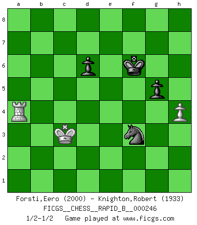 Last move : 1/2-1/2 2017 March 27 6:16:30 [Event "FICGS__CHESS__RAPID_B__000246"] [Site "FICGS"] [Date "2016.11.08"] [Round "1"] [White "Forsti,Eero"] [Black "Knighton,Robert"] [Result "1/2-1/2"] [WhiteElo "2000"] [BlackElo "1933"] 1.e4 c5 2.Nc3 Nc6 3.d3 e6 4.g3 g6 5.Bg2 Bg7 6.Be3 d6 7.Qd2 Bd7 8.Nf3 Nd4 9.O-O Ne7 10.Bh6 O-O 11.Nd1 e5 12.Bxg7 Kxg7 13.Nh4 f5 14.c3 Ne6 15.exf5 gxf5 16.f4 exf4 17.gxf4 Kh8 18.Ne3 Qe8 19.Kh1 Qh5 20.Qf2 Rab8 21.Nd5 Nxd5 22.Bxd5 Rf6 23.Ng2 Bb5 24.Rad1 b6 25.Ne3 Re8 26.b4 Rh6 27.Rg1 Nc7 28.Rg5 Qh4 29.Qxh4 Rxh4 30.Nxf5 Nxd5 31.Nxh4 Nxf4 32.Rf5 Ne2 33.Ng2 Nxc3 34.Rd2 Bc6 35.Kg1 cxb4 36.Rf7 a5 37.Nf4 b5 38.Rc7 Rg8+ 39.Kf1 Be8 40.Rb2 Rf8 41.Rf2 Kg8 42.Rc8 Bf7 43.Rg2+ Bg6 44.Rxf8+ Kxf8 45.Nxg6+ hxg6 46.Ke1 Kf7 47.Rg5 Kf6 48.h4 a4 49.Kd2 Nxa2 50.Rxb5 b3 51.Ra5 b2 52.Kc2 Nb4+ 53.Kxb2 Nxd3+ 54.Kc2 Ne1+ 55.Kc3 Nf3 56.Rxa4 g5 1/2-1/2 Sicilian : Closed, 2...Nc6 Kingside Castling by player White (move 9) Kingside Castling by player Black (move 10) 10 pieces endgame at move 50 : White KRPP , Black KNPPPP WHITE : King + 1 Rook 2 Pawns BLACK : King + 1 Knight 4 Pawns 9 pieces endgame at move 53 : White KRPP , Black KNPPP WHITE : King + 1 Rook 2 Pawns BLACK : King + 1 Knight 3 Pawns 8 pieces endgame at move 53 : White KRP , Black KNPPP WHITE : King + 1 Rook 1 Pawn BLACK : King + 1 Knight 3 Pawns 7 pieces endgame at move 56 : White KRP , Black KNPP WHITE : King + 1 Rook 1 Pawn BLACK : King + 1 Knight 2 Pawns This chess game ended in a draw. Follow this game move after move (download)The King is a fighting piece. Use it ! (Wilhelm Steinitz) Es ist besser die Steine des Gegners zu opfern. (Savielly Grigorievitsch Tartakower) El Ajedrez es un expediente tonto que hace creer a la gente inactiva que hacen una cosa muy astuta cuando solamente estan perdiendo su tiempo. (George Bernard Shaw) Le génie consiste à savoir transgresser les règles au moment opportun. (Teichmann) Gambling is the son of avarice and the father of despair. (French proverb)