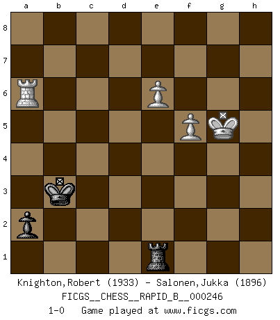 Last move : 1-0 2017 March 16 9:17:11 [Event "FICGS__CHESS__RAPID_B__000246"] [Site "FICGS"] [Date "2016.11.08"] [Round "1"] [White "Knighton,Robert"] [Black "Salonen,Jukka"] [Result "1-0"] [WhiteElo "1933"] [BlackElo "1896"] 1.g4 d5 2.Bg2 e5 3.d4 exd4 4.Qxd4 Nf6 5.g5 Nc6 6.Qe3+ Ne4 7.Bxe4 dxe4 8.Qxe4+ Qe7 9.Qxe7+ Bxe7 10.c3 f6 11.h4 O-O 12.gxf6 Bxf6 13.Bg5 b6 14.Bxf6 Rxf6 15.Nd2 Bb7 16.f3 Rh6 17.O-O-O Rd8 18.Ne4 Rxd1+ 19.Kxd1 Ne5 20.Ng3 Rg6 21.Nf1 Nc4 22.Kc2 Rg2 23.b3 Ne5 24.Kc1 Ng6 25.Ne3 Rg3 26.Nf5 Rg2 27.Kd2 Nf4 28.Ke1 Kf8 29.Ne3 Rg6 30.Nh3 Nxh3 31.Rxh3 b5 32.Nc2 Kf7 33.Nd4 Bc8 34.h5 Rb6 35.Rh4 Bd7 36.Nc2 c5 37.c4 Ra6 38.a3 Ra5 39.Rf4+ Kg8 40.b4 cxb4 41.axb4 Ra2 42.Ne3 bxc4 43.Nd5 h6 44.Rxc4 Be6 45.Rc5 Bxd5 46.Rxd5 Rb2 47.b5 Kf7 48.Kf2 Ke6 49.Rc5 Kd6 50.Rc6+ Ke5 51.Rg6 Rxb5 52.Rxg7 a5 53.Rg6 Kd5 54.Rxh6 Kc4 55.Ra6 Rxh5 56.f4 Kb3 57.e4 a4 58.e5 Rh8 59.Kf3 Rh1 60.e6 a3 61.f5 Re1 62.Kf4 a2 63.Kg5 1-0 Grob's attack Kingside Castling by player Black (move 11) Queenside Castling by player White (move 17) 10 pieces endgame at move 51 : White KRPPP , Black KRPPP WHITE : King + 1 Rook 3 Pawns BLACK : King + 1 Rook 3 Pawns 9 pieces endgame at move 52 : White KRPPP , Black KRPP WHITE : King + 1 Rook 3 Pawns BLACK : King + 1 Rook 2 Pawns 8 pieces endgame at move 54 : White KRPPP , Black KRP WHITE : King + 1 Rook 3 Pawns BLACK : King + 1 Rook 1 Pawn 7 pieces endgame at move 55 : White KRPP , Black KRP WHITE : King + 1 Rook 2 Pawns BLACK : King + 1 Rook 1 Pawn Player White won this chess game. Follow this game move after move (download)There are two types of sacrifices: correct ones and mine. (Mikhail Tal) Wenn Du einsam bist, wenn Du Dich in der Welt wie ein Fremder fühlst, spiele Schach. Das wird Deinen Geist erheben und Dein Ratgeber im Kampf sein. (Aristoteles) El Ajedrez es tan interesante por sí solo, que no es necesario un interés monetario para persuadir a una persona a que lo practique; por lo tanto, nunca se juega por dinero. (Benjamin Franklin) On croit qu'il y a plus de mauvais joueurs que de bons joueurs, c'est faux : Il y a autant de joueurs qui gagnent que de joueurs qui perdent. (Philippe Geluck) If you know the enemy and know yourself you need not fear the results of a hundred battles. (Sun Tzu)